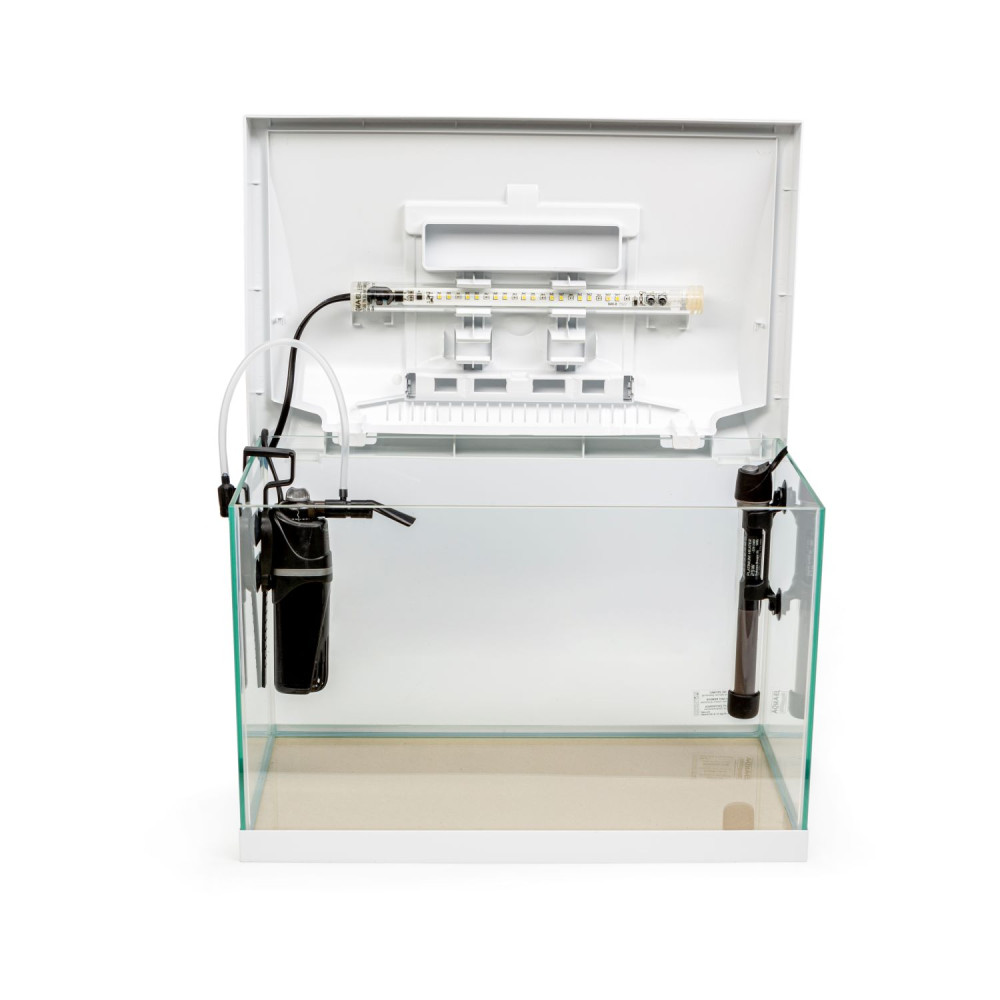 • Кришка акваріума оснащена запатентованою системою SMART OPEN, яка дозволяє зручно виконувати будь-які роботи з обслуговування всередині акваріума без необхідності підтримувати кришку. Велика заслінка дозволяє зручно годувати рибу, а спеціальні канавки в задній частині дозволяють вирізати отвори для установки будь-якого типу каністрового фільтра.
