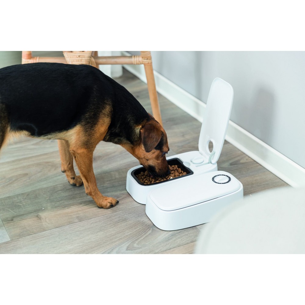 Виготовлена годувальниця з безпечних для здоров’я тварин, матеріалів, що не містять у складі шкідливих речовин, оснащена 48 – ми годинним таймером. Підходить для вологого корму, за рахунок наявності акумулятору холоду, що йде в комплекті, і розміщений під ємністю для годування. Живлення отримує від батарейок типу АА.