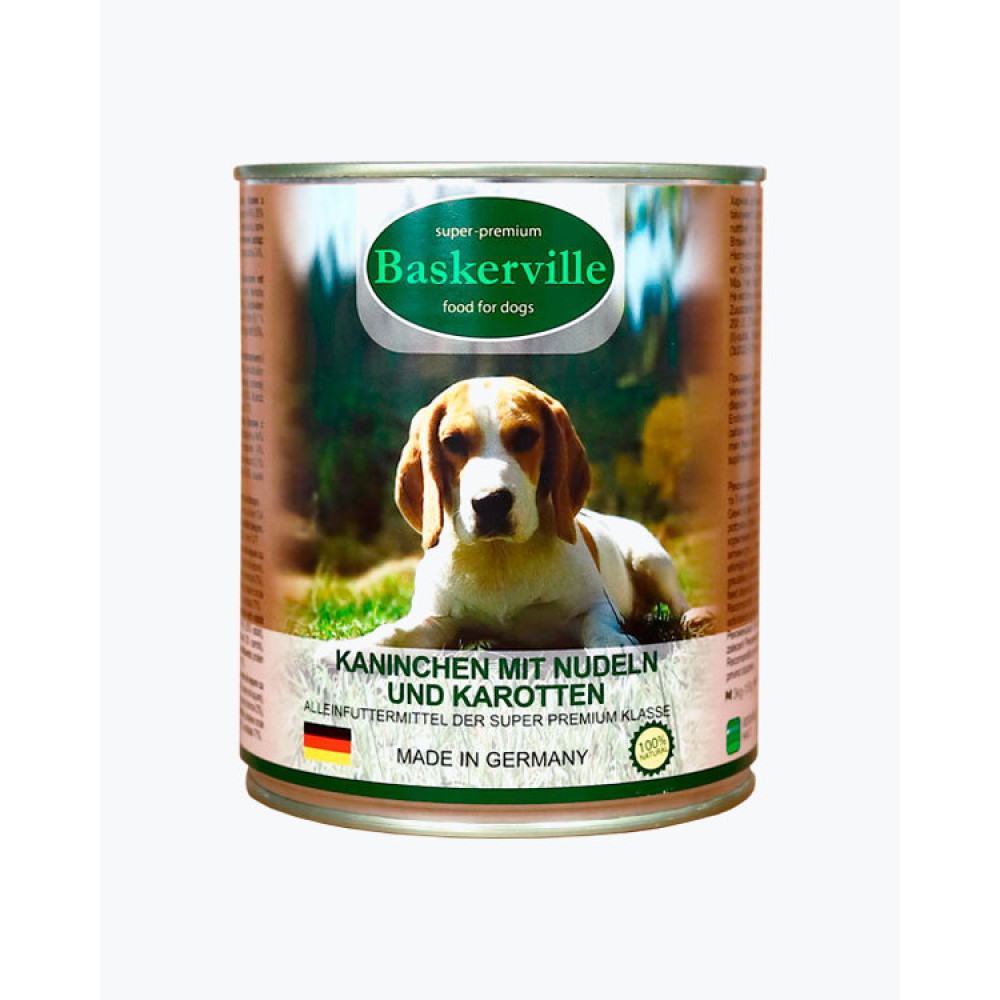 Вологий корм Baskerville – це повноцінний збалансований корм суперпреміум класу для собак з чутливим травленням, молодим та дорослим собакам з нормальною та підвищеною активністю. М’ясо кролика це низькокалорійне дієтичне м’ясо, містить 29 амінокислот, серед них 6 незамінних органічних сполук, що покривають добову потребу на 30-50%. Кролячий жир унікальний тим, що містить багато лецитину, який регулює вироблення холестерину, а насичені та ненасичені жирні кислоти знаходяться в ідеальній пропорції, що сприятливо позначається на розщепленні ліпідів. М’ясо кролика багате на вітаміни та мінеральні елементи, має високий вміст заліза, калію, сірки, фосфору, селену, цинку, міді. До складу корму додана морква, яка впливає на роботу всіх органів та систем організму: уповільнює засвоєння жирів та вуглеводів; пов’язує та виводить з організму токсичні речовини; сприяє очищенню кишківника, покращує перистальтику та регулює мікрофлору. Крім того, доведено, що вона має протигельмінтні властивості.