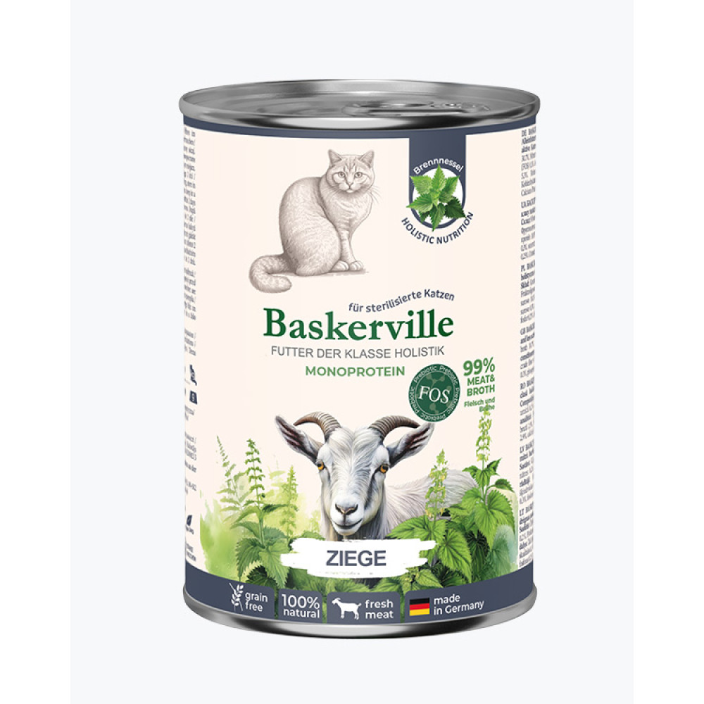 Монопротеїновий корм BASKERVILLE — це збалансований вологий корм класу холістик, створений для котів, які потребують поживного, натурального та гіпоалергенного харчування. Його основа — ніжне м’ясо кози, що є рідкісним, але надзвичайно корисним джерелом білка для тварин із чутливим травленням або харчовими алергіями. Цей корм забезпечує повноцінне щоденне харчування, насичене білками, вітамінами, мінералами та природними пребіотиками. Завдяки класу холістик, усі інгредієнти мають натуральне походження, без штучних барвників, ароматизаторів чи консервантів.