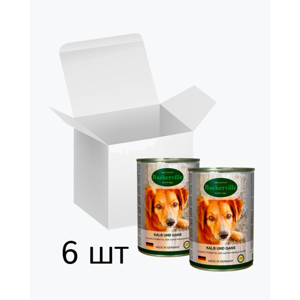 Вологий корм Baskerville – це повноцінний збалансований корм суперпреміум класу для собак з нормальною та підвищеною активністю. М’ясо теляти багате на поживні речовини, за змістом біологічно активних речовин телятина вважається одним з найбільш корисних видів м'яса, причому навіть під час термічної обробки більша частина корисних речовин зберігається. Містить багато вітамінів групи В, холін та вітамін РР, які відповідають за здоров'я серцево-судинної та нервової систем, покращують травлення, регулюють рівень холестерину в крові. Корисні вітаміни та мінерали, що містяться в гусячому м’ясі, таких як калій, хлор і натрій сприятливо впливають на організм тварини та підтримують водний баланс, а сірка нормалізує всі обмінні процеси організму тварини. При постійному вживанні цих інгредієнтів налагоджується робота травної системи.