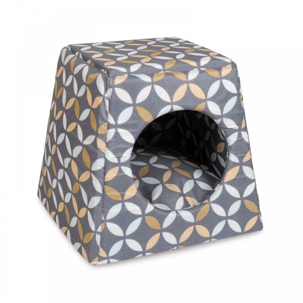 Практичний будиночок з м'якої бавовняної тканини сподобається не тільки котам, а й невеликим собакам. Цуценята і кошенята також будуть задоволені. Лежак-трансформер можна використовувати в 2 положеннях: як будиночок з круглим входом і м'якою подушкою всередині або як лежак-диван – потрібно лише натиснути долонею на «дах» будиночка, попередньо вийнявши з нього подушку, а потім покласти її назад до лежака.