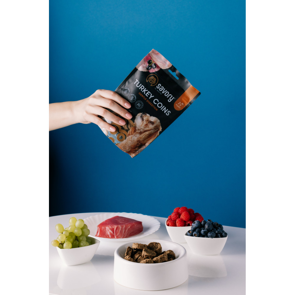 Лінійка ласощів Джерки від Savory – це нове поєднання улюблених смаків, високий вміст м’яса та щільні великі шматочки які можна смакувати ще довше. Монетки не містять зернових та інших додаткових вуглеводів, що робить їх абсолютно безпечними для улюбленців які мають чутливість до глютену. Додавання добірних ягід робить ці смаколики Savory не лише приємним але й корисним перекусом.