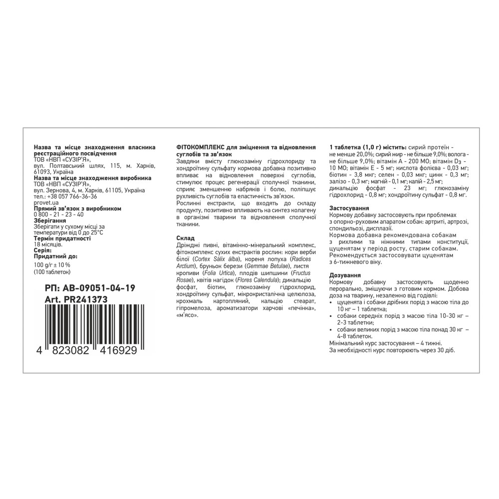 Завдяки вмісту глюкозаміну гідрохлориду та хондроїтину сульфату, кормова добавка позитивно впливає на відновлення поверхні суглобів, стимулює процес регенерації сполучної тканини, сприяє зменшенню набряків і болю, рухливості суглобів та еластичності зв’язок. Рослинні екстракти, що входять до складу продукту, позитивно впливають на синтез колагену в організмі тварини та відновлення сполучної тканини.