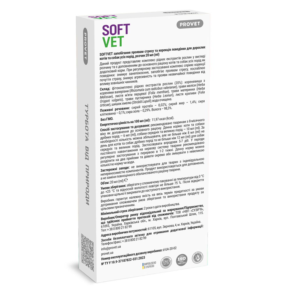Продукт ― це комплекс рідких екстрактів рослин у вигляді розчину та є доповненням до основного раціону котів та собак усіх порід як додатковий корм. Комплекс сприяє корекції поведінки — зниженню занепокоєння, запобіганню проявам стресу, послабленню почуття страху, зниженню агресивності та проявів незвичайної поведінки від впливу зовнішніх чинників.