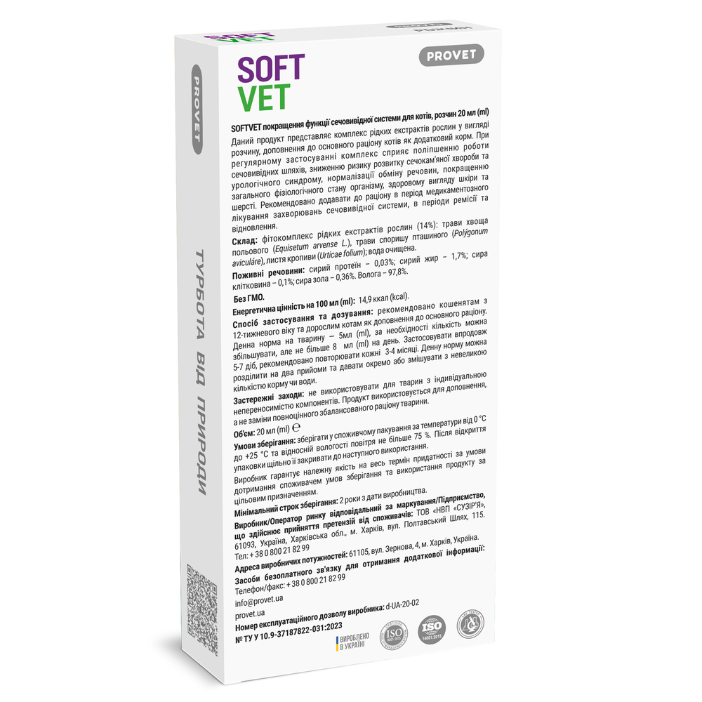 Продукт ― це комплекс рідких екстрактів рослин у вигляді розчину, доповнення до основного раціону котів як додатковий корм. Комплекс сприяє поліпшенню роботи сечовивідних шляхів, зниженню ризику розвитку сечокам’яної хвороби та урологічного синдрому, нормалізації обміну речовин, покращенню загального фізіологічного стану організму, здоровому вигляду шкіри та шерсті.