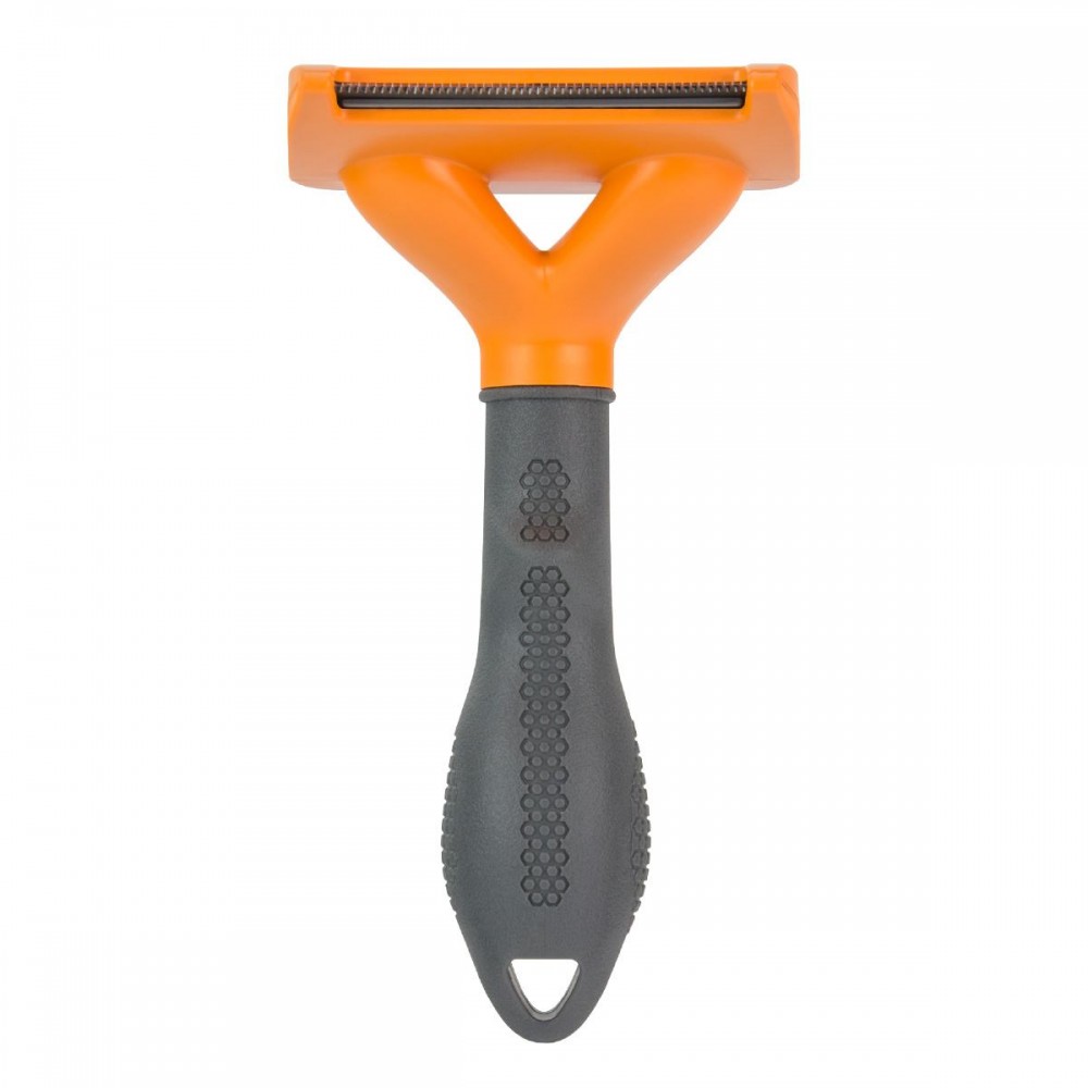 - Леза із нержавіючої сталі. Проникає крізь остьові волосини, не пошкоджуючи їх, і легко витягує мертві, слабо прикріплені волосинки підшерстя. Вигнуте лезо відповідає контурам тіла тварини для комфорту в процесі вичісування.