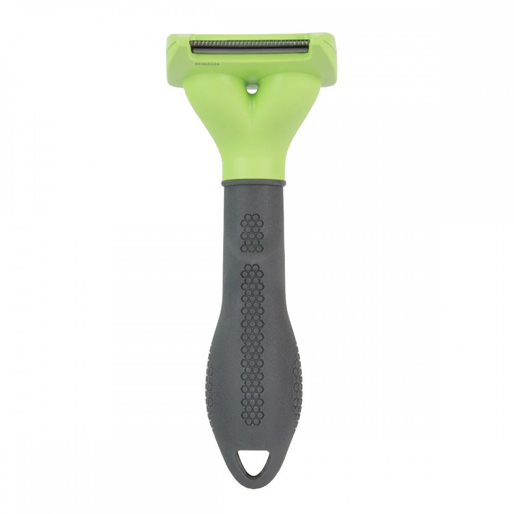 - Леза із нержавіючої сталі. Проникає крізь остьові волосини, не пошкоджуючи їх, і легко витягує мертві, слабо прикріплені волосинки підшерстя. Вигнуте лезо відповідає контурам тіла тварини для комфорту в процесі вичісування.