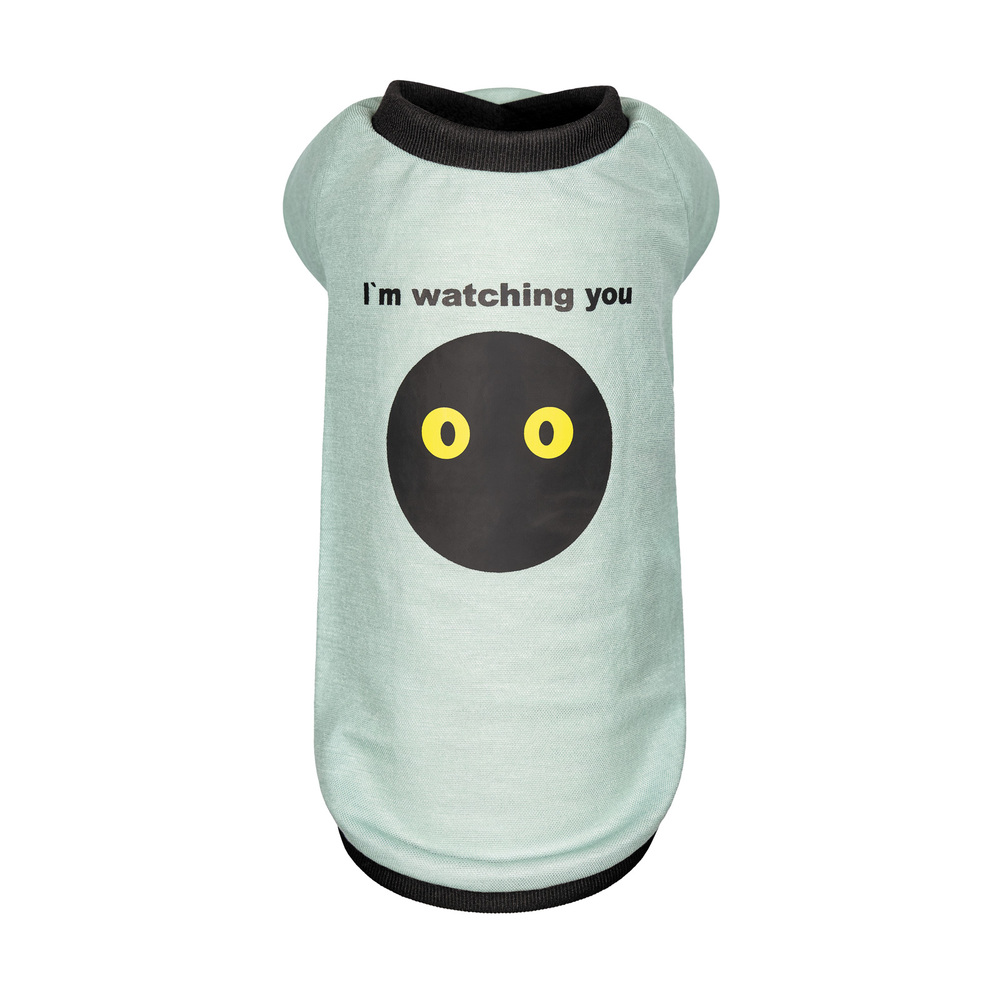 Комфорт і практичність для вас і для хвостика! Легенька блакитна футболка з резинками на горловині, рукавах та подолі – чудовий одяг для прогулянки в спеку та прохолодну погоду. А загадкова мордочка з великими жовтими очима – це нагадування, що вашому хвостику потрібна увага, бо він все бачить, все чує і за першої нагоди пригадає, як ви не пригостили його смачненьким чи не дали полежати в гамаку.