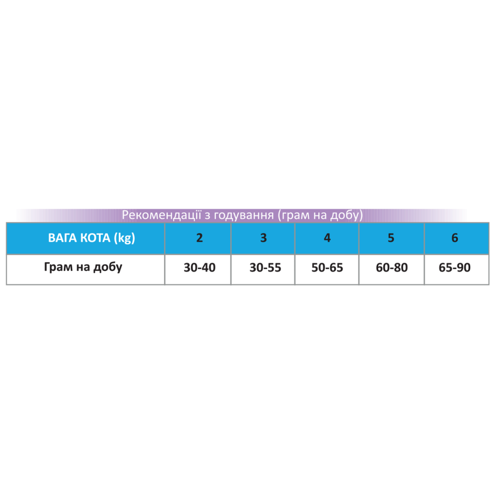 Рекомендації по годівлі: не обмежуйте кількість корму або дотримуйтесь зазначену на упаковці добову норму. ВАЖЛИВО, щоб тварина завжди мало доступ до чистої, свіжої води. Добову норму необхідно розділити на 2-3 годування. Не рекомендується обмежувати кількість корму лактуючим самкам.