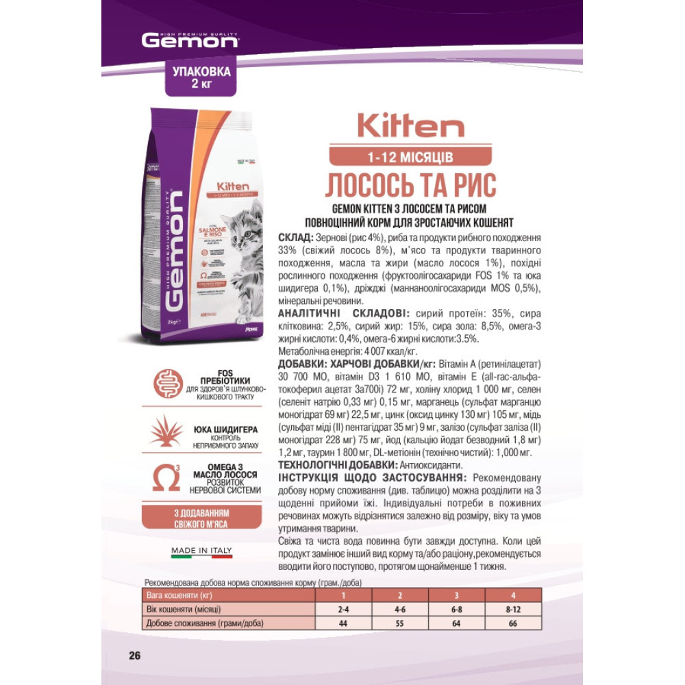 Gemon Kitten (1-12 місяців) з лососем і рисом - повнораціонний корм для кошенят, які ростуть. Рецептура характеризується високоякісними інгредієнтами, такими як лосось, джерело необхідних поживних речовин, і рис, джерело вуглеводів, які легко засвоюються завдяки процесу екструзії. Збалансована дієта з пребіотиками, фруктоолігосахаридами (FOS) і маннанолігосахаридами (MOS) для підтримки здоров'я кишечника та юкою шидігерою для контролю запаху стільця.Містить свіжу рибу для оптимального смаку та джерельну лососеву олію омега-3 для сприяння нормальному розвитку неврологічних захворювань. системи під час росту. Також розроблено без додавання штучних барвників і консервантів.