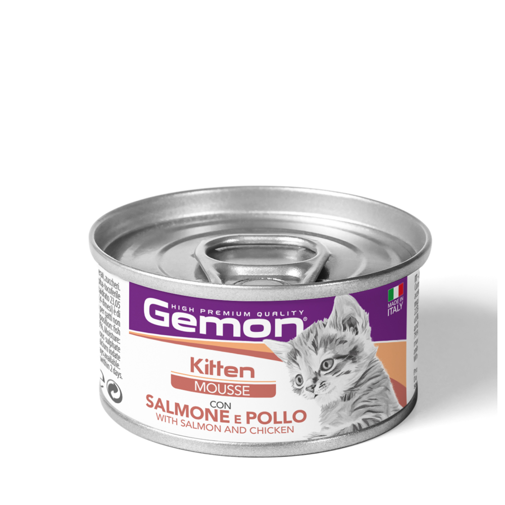 Gemon Kitten Mousse with Salmon and Chicken — повнораціонний корм для кошенят, що ростуть, розроблений таким чином, щоб забезпечити всіма поживними речовинами, необхідними для щоденної життєдіяльності наших чотирилапих друзів. GEMON HIGH PREMIUM QUALITY — це лінія повнораціонних кормів, складених з якісних інгредієнтів, відібраних відповідно до харчових потреб ваших тварин. Надзвичайно смачні корми, спеціально розроблені для різного віку та способу життя тварин. Без додавання штучних барвників та консервантів. Зроблено в Італії.