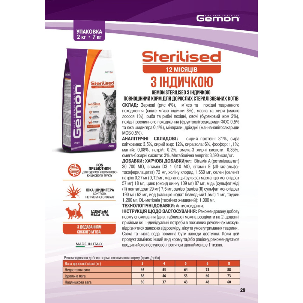Gemon Sterilised with Turkey (+ 12 місяців) - це повнораціонний корм для стерилізованих дорослих котів. Рецептура характеризується якісними інгредієнтами, такими як індичка, джерело необхідних поживних речовин, і рис, джерело вуглеводів, приготований і добре засвоюваний завдяки процесу екструзії. Ідеальна дієта для стерилізованих кішок із пребіотиками, фруктоолігосахаридами (FOS) і маннанолігосахаридами (MOS) для підтримки нормального стану кишечника та буряковою м’якоттю для підтримки ідеальної маси тіла. Містить свіже м'ясо для оптимального смаку та лососеву олію для блиску та м'якості хутра. Також містить юку Шидігеру для контролю кишкових запахів. Без додавання штучних барвників та консервантів.