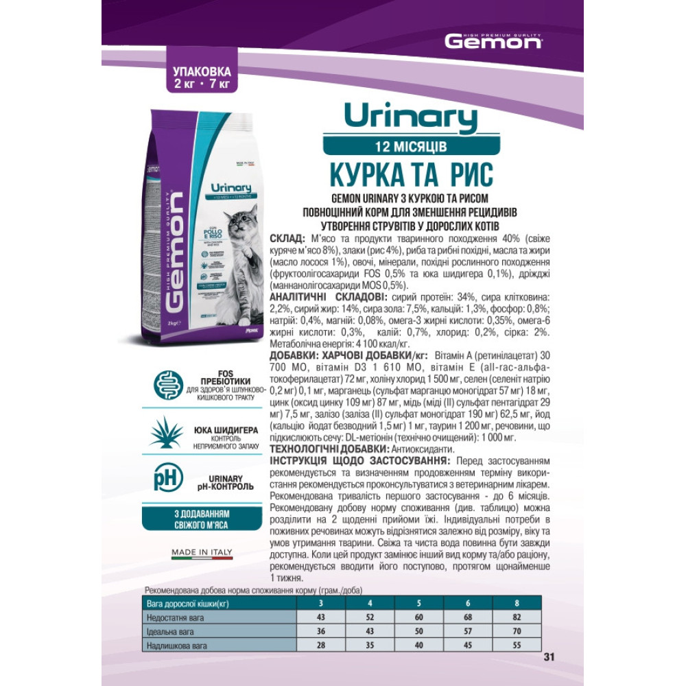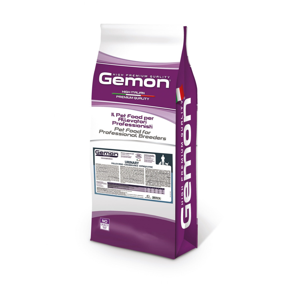 GEMON ADULT CAT (+ 12 МІСЯЦІВ) URINARY З КУРКОЮ І РИСОМ — повноцінний дієтичний корм, розроблений для зменшення рецидивів струвітного каміння у дорослих кішок. Корм характеризується властивостями, що підкислюють сечу, і помірною концентрацією магнію (Mg). Рецептура характеризується використанням якісних інгредієнтів, таких як курка, джерело необхідних поживних речовин. Всі інгредієнти з'єднуються між собою завдяки високотехнологічному процесу екструзії. Ідеальний раціон для дорослих кішок з пребіотиками, фруктоолігосахаридами (ФОС) та маннанолігосахаридами (МОС) для підтримки здоров'я кишечника та юккой Шидігера для контролю кишкових запахів. Містить свіже м'ясо для прекрасного смаку та олію лосося для блиску та м'якості вовни. Також розроблений без додавання штучних барвників та консервантів.