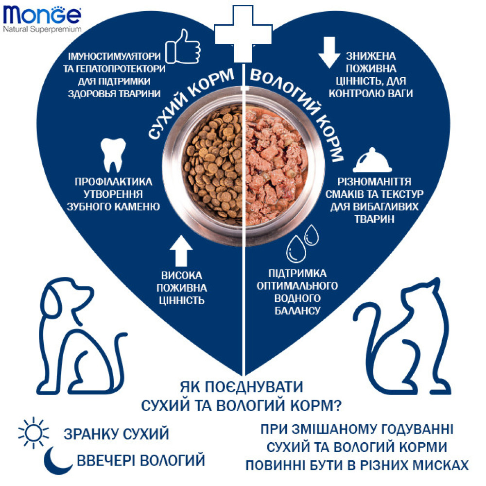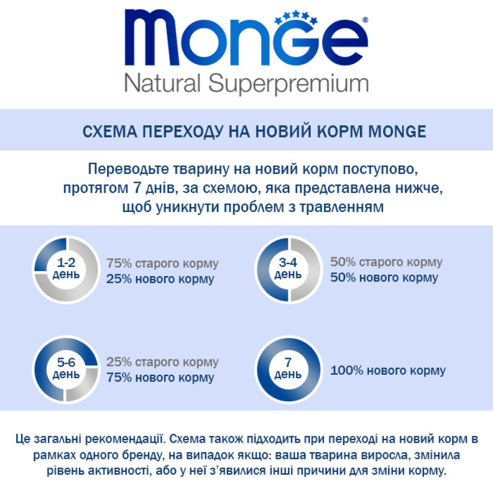 Рекомендований добовий раціон, зазначений у таблиці, можна розділити на 2 прийоми їжі. Кількість може бути адаптована залежно від розміру, віку та фізичної активності тварини. Завжди залишайте доступною свіжу чисту воду. Якщо продукт замінює інший вид корму та/або тип раціону, рекомендується вводити його поступово, протягом принаймні 1 тижня. Корм для собак не підходить для споживання людиною.