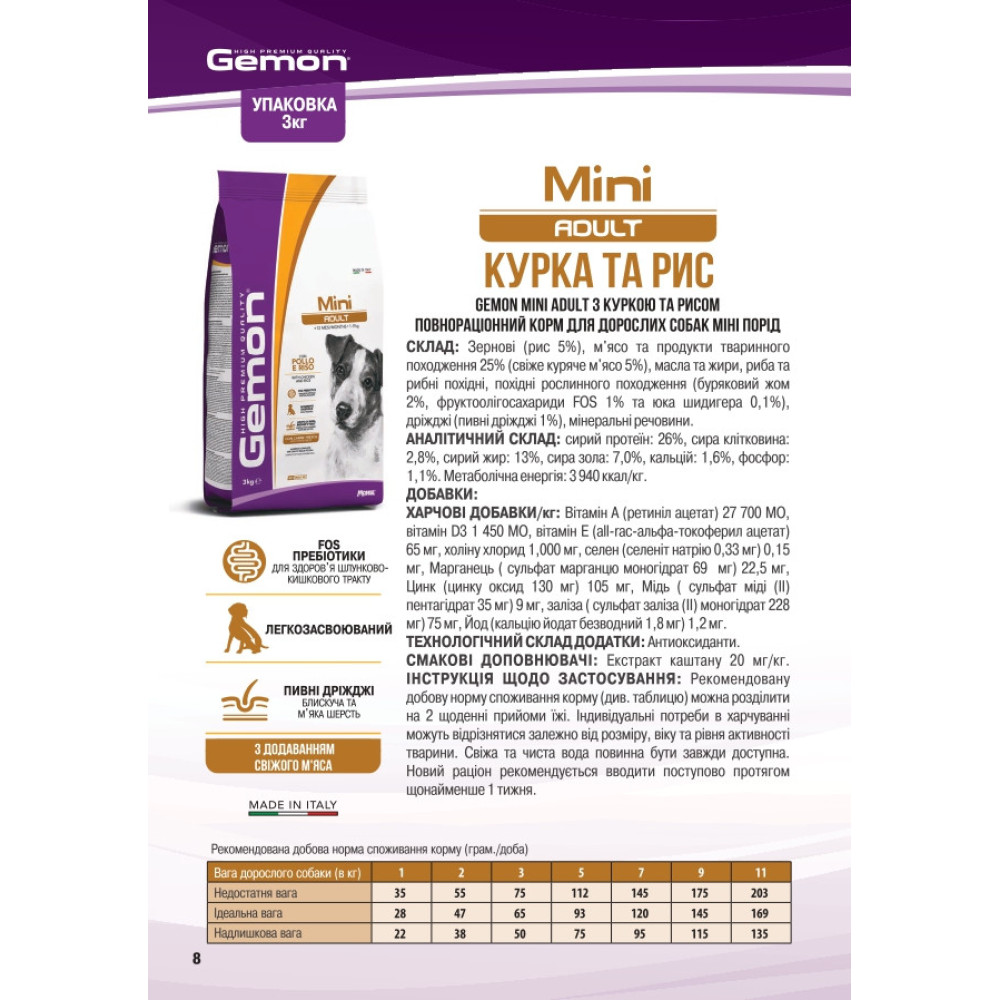 GEMON MINI ADULT З КУРКОЮ ТА РИСОМ - це повнораціонний корм для дорослих собак мініатюрних розмірів. Рецептура характеризується високоякісними інгредієнтами, такими як курка, джерело необхідних поживних речовин, і рис, джерело вуглеводів, які легко засвоюються завдяки процесу екструзії. Збалансоване харчування з пребіотиками, такими як фруктоолігосахариди (ФОС), і буряковим жомом, джерелом нерозчинної клітковини для нормальної роботи кишкового тракту. Містить свіже м’ясо для оптимального смаку та пивні дріжджі для густої та м’якої шерсті. Також містить юку Шидігеру для контролю кишкових запахів. Без додавання штучних барвників та консервантів.
