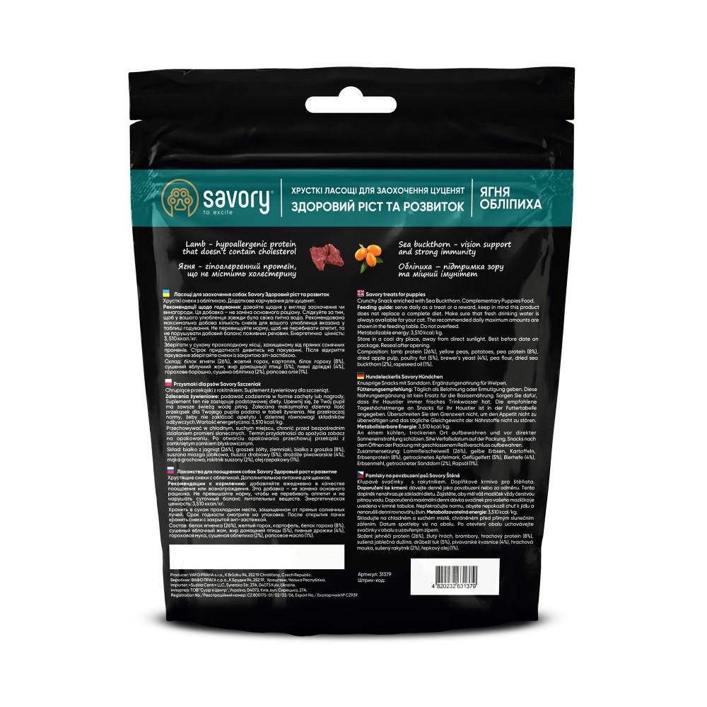 Хрусткі ласощі Savory для цуценят усіх порід. Додаткове харчування, яке можна використовувати у якості заохочення та, як винагороду для улюбленця. Не тільки висока смакова привабливість, але й корисні складові, що є основою здорового харчування, роблять ласощі Savory ідеальним доповненням до основного раціону і частуванням для вашого улюбленця.