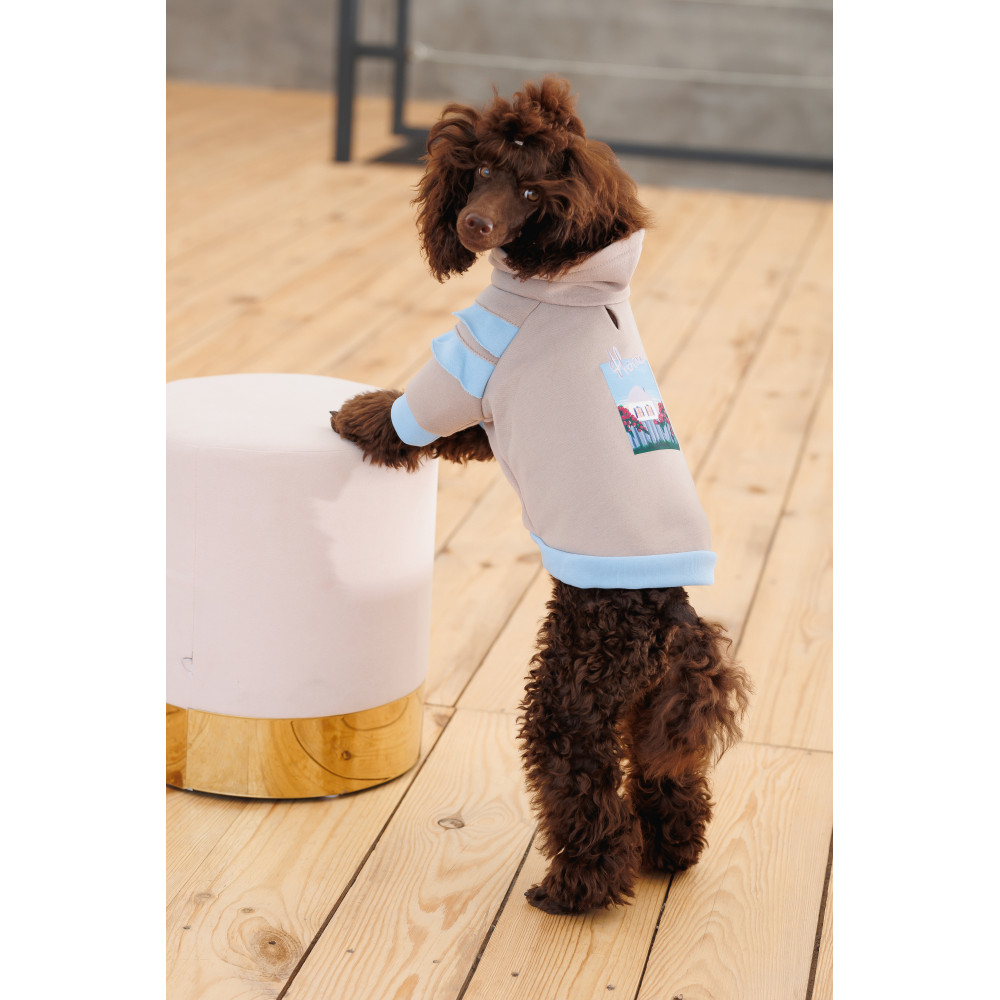 Модель створена з турботою про максимальний комфорт чотирилапих красунь. Завдяки еластичності тканини худі зручно вдягати через голову. Резинки на рукавах і на подолі не дають холодному повітрю потрапляти під одяг. Високий комір оригінального крою дуже доречний у вітряну погоду, в основі коміру є отвір для повідця.