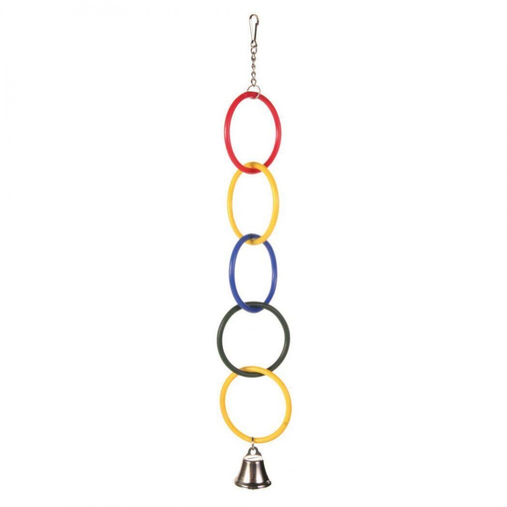 Гірлянда з різнокольорових кілець з дзвіночком порадує пернатого улюбленця, не дасть йому нудьгувати і допоможе підтримувати хорошу «спортивну» форму.