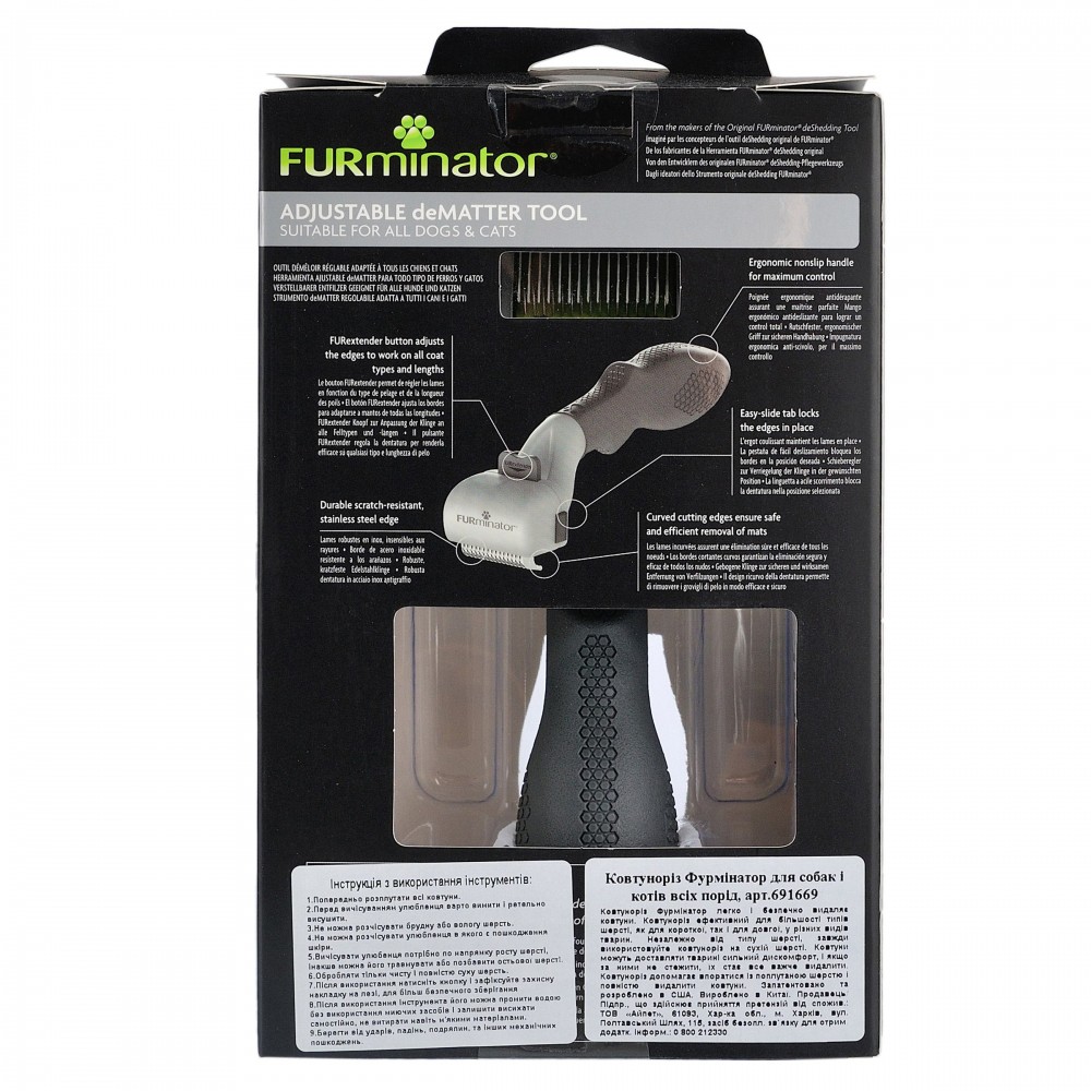 Використовуйте регульований ковтуноріз FURminator® згідно з рекомендаціями щодо застосування. Ковтуни можуть доставляти тварині сильний дискомфорт, і якщо за ними не стежити, їх все важче видалити. Ковтуноріз допомагає впоратися зі сплутаною шерстю та повністю видалити ковтуни.