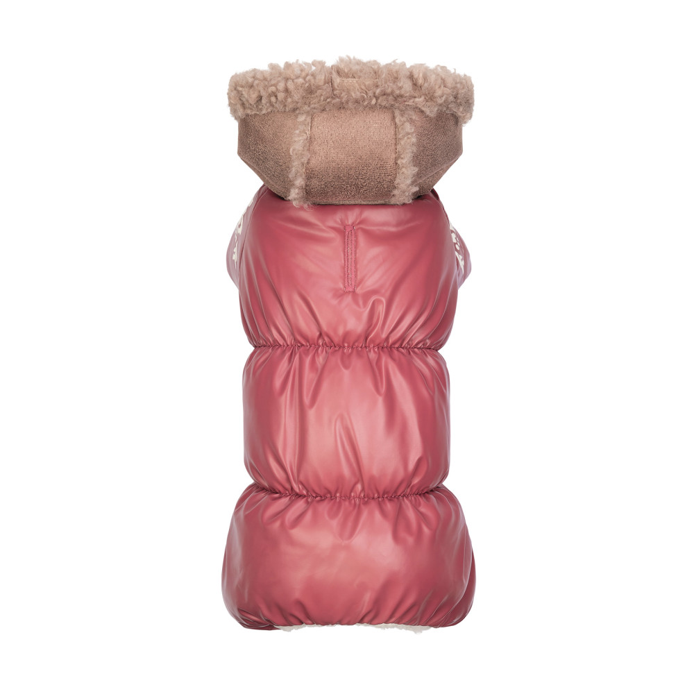 Комбінезон чудово захищає від холоду та вологи, бо зшитий з водонепроникної тканини. Резинки на манжетах і на спинці забезпечують щільне прилягання до тіла. Капюшон пудрового кольору зі штучного дубляжа не лише чудово зігріває, але й прикрашає виріб. Комбінезон має застібку – кнопки на грудях.