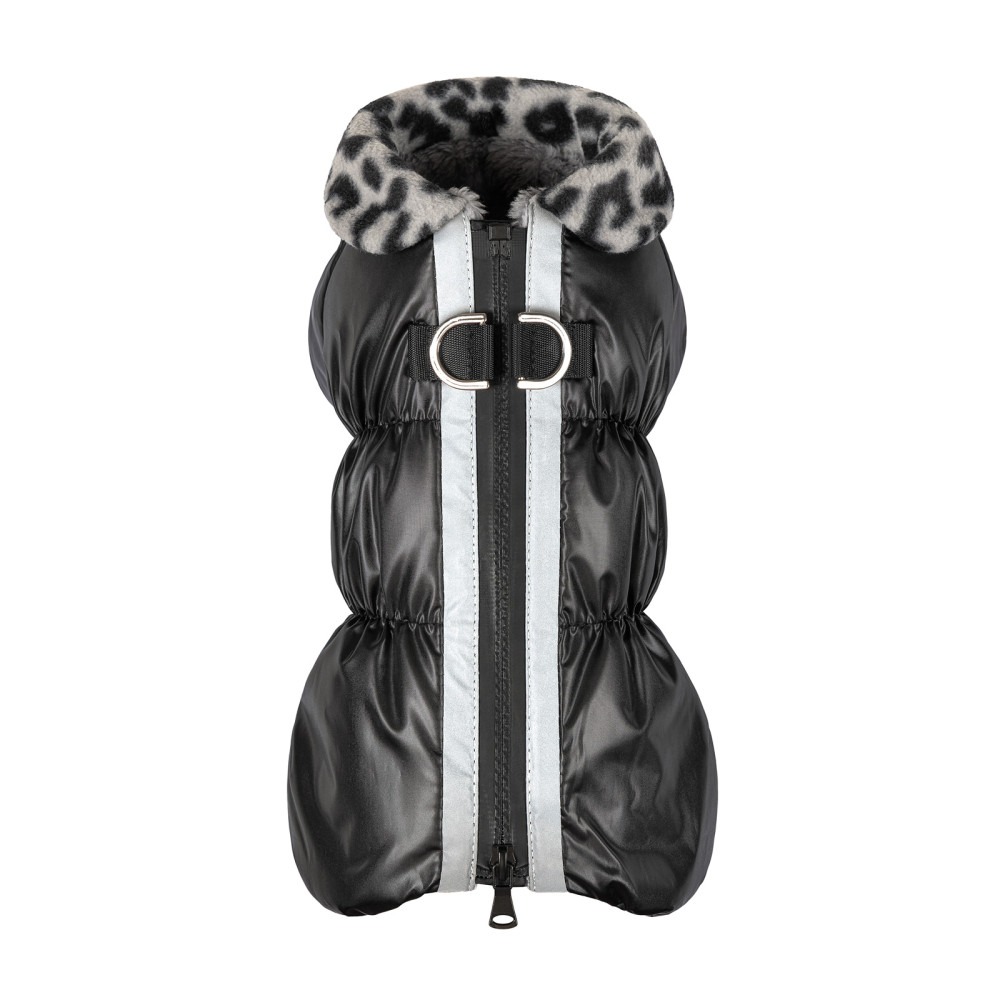 Модель для песиків, які полюбляють довгі прогулянки у будь-яку погоду: сніг, дощ, вітер. Зимовий комбінезон не пропускає вологу, бо зшитий із водовідбивної плащової тканини, він теплий та легкий завдяки якісному силіконовому утеплювачу та пухнастій підкладці. Резинки на поясі та лапках запобігають потраплянню холодного повітря під одяг. Високий пухнастий комір робить модель ще затишнішою та теплішою. Задля більшої безпеки на спинці нашиті світловідбивні стрічки. Півкільця дають можливість зручно кріпити повідець безпосередньо до комбінезону.