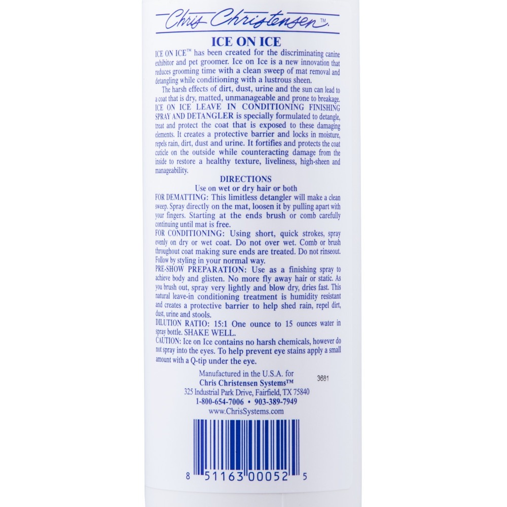 Chris Christensen Ice on Ice Detangling and Finishing Spray додає еластичності та міцності шерсті, відштовхує бруд, пил, сечу та інші забруднювачі, які можуть пошкодити та ослабити шерсть. Водорозчинна формула може бути додана до останнього ополіскування для отримання справді красивої шерсті.