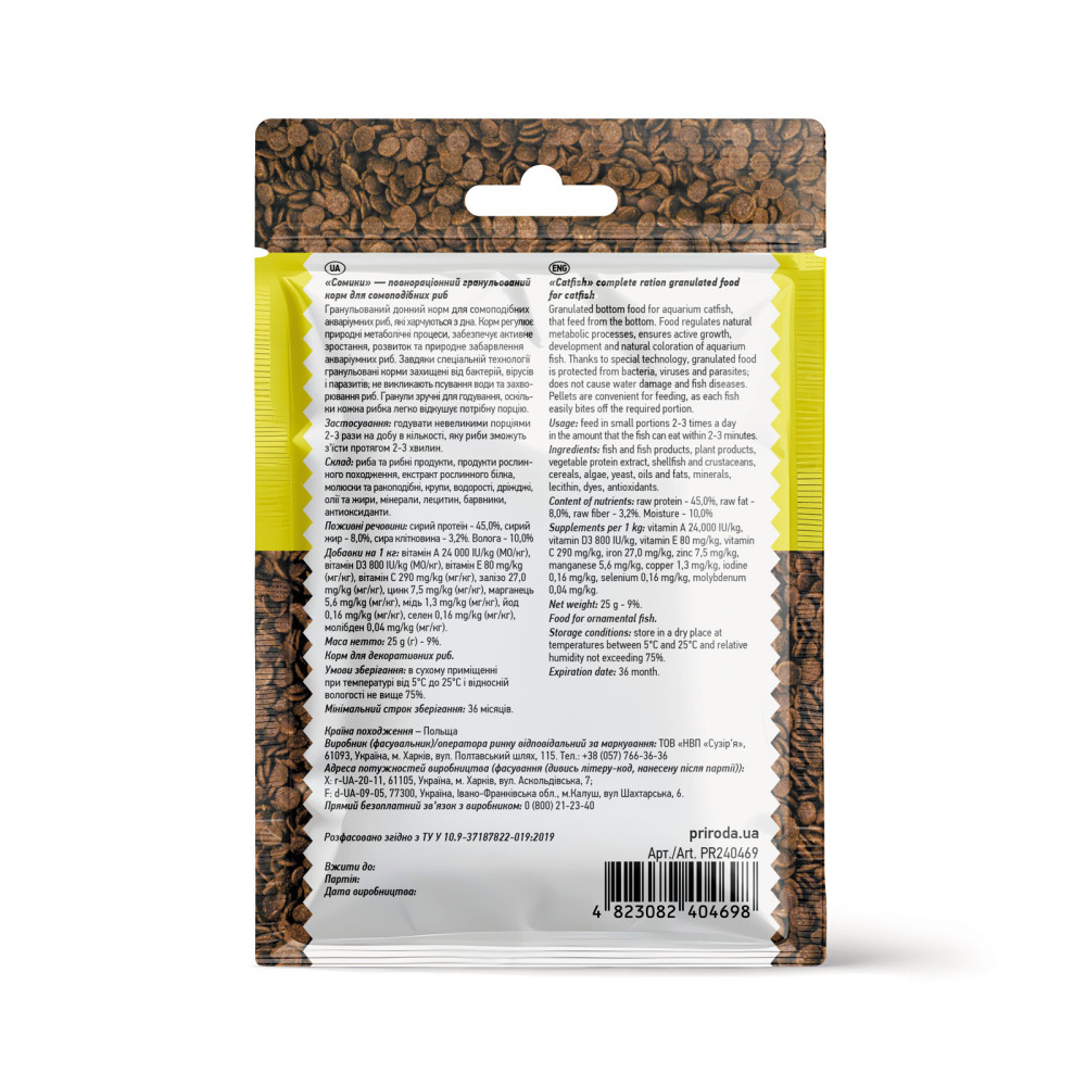 Гранульований донний корм для сомоподобних акваріумних риб, які харчуються з дна. Корм регулює метаболічні процеси, забезпечує активне зростання, правильний розвиток і яскравий природний забарвлення.