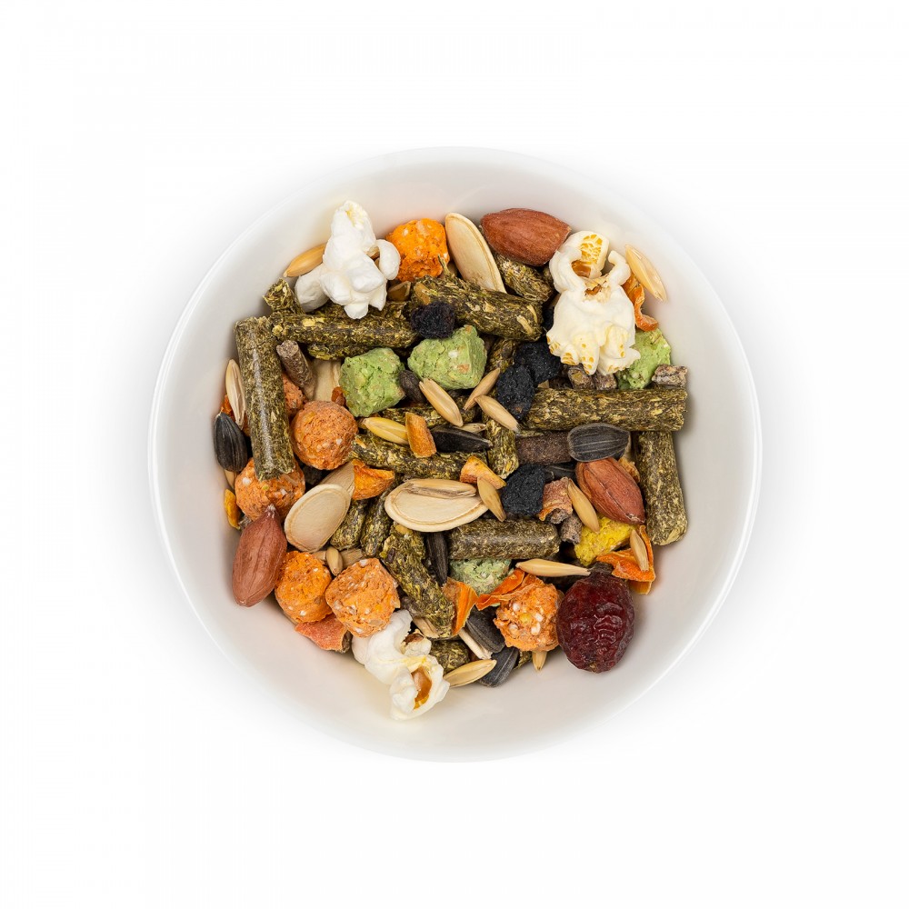 Склад: пшениця, крупа горохова, шипшина, горобина, трав’яний гранулят в асортименті, яблуко сушене гранульоване, сушена морква, насіння соняшнику, арахіс, насіння гарбуза, фруктово-зерновий гранулят, овочево- зерновий гранулят, злаково-трав’яний гранулят, кероб подрібнений, попкорн, овес, овес голозерний, комбікорм.