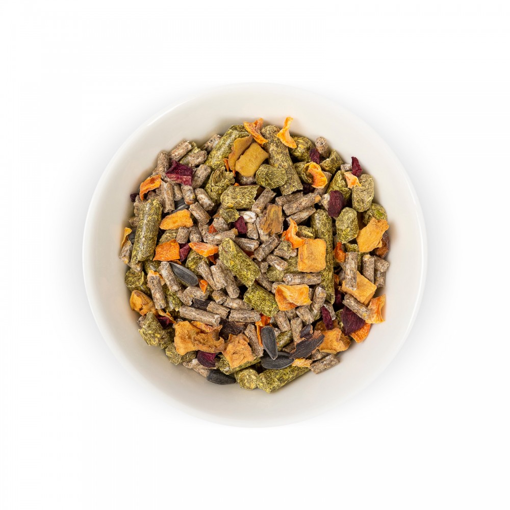 Базова суміш гранулятів доповнена сухими овочами, фруктами, керобом. Сучасна технологія виробництва гранулятів дозволяє максимально зберегти всі вітаміни та корисні речовини: білки, вуглеводи, антиоксиданти, пектини, незамінні амінокислоти, макро- та мікроелементи. Гранулят можна використовувати як основний корм чи корисне додавання до базового раціону. Тверді гранули дозволяють гризунам сточувати зуби.