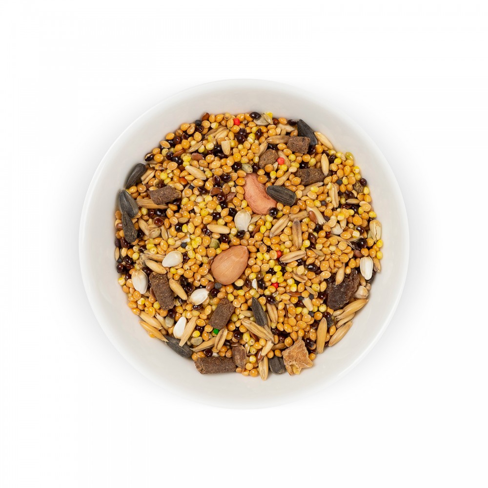 Склад: канаркове насіння, насіння конопель, насіння льону, арахіс, насіння соняшнику, ріпак, яблука сушені гранульовані, просо чорне, овес голозерний, сафлор, просо, пшоно, сорго.