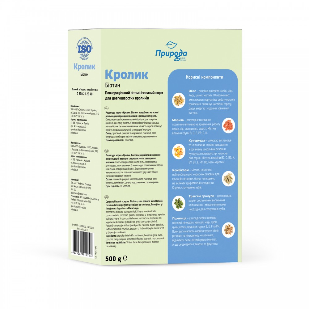 Рецептура корму «Кролик + біотин» розроблена на основі рекомендацій провідних фахівців з розведення кролів.