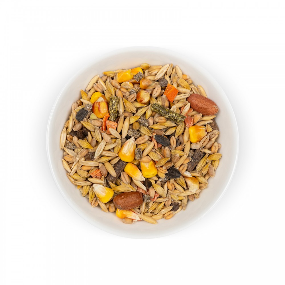 Склад: горохова крупа, комбікорм, кукурудза, овес, сорго, арахіс, насіння соняшнику, гречка, яблука сушені гранульовані, пшениця, ячмінь, сушена морква, трав’яне борошно гранульоване в асортименті.