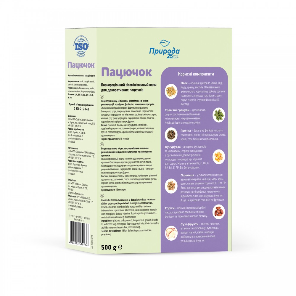 Збалансований раціон сприяє формуванню красивого блискучого хутра, покращує його пігментацію. Корм містить натуральні інгредієнти, які збагачують раціон вітамінами: зерно, насіння, суху траву у гранулах. Сюрприз для вашого пацючка – корисні смачні горішки та сухофрукти.