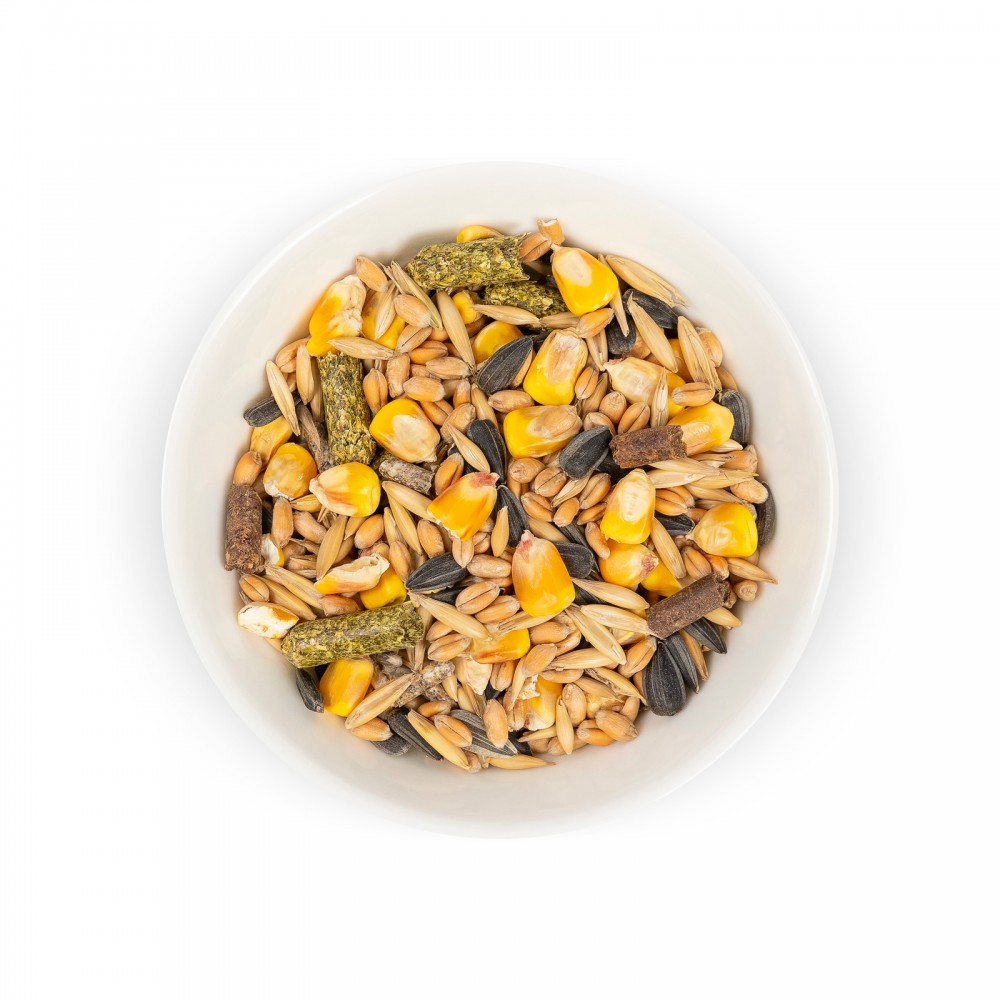 Склад: злаково-фруктовий гранулят, овес, насіння соняшнику, кукурудза, арахіс, яблука сушені гранульовані, комбікорм, вівсяні пластівці, пшениця, трав’яне борошно гранульоване в асортименті.