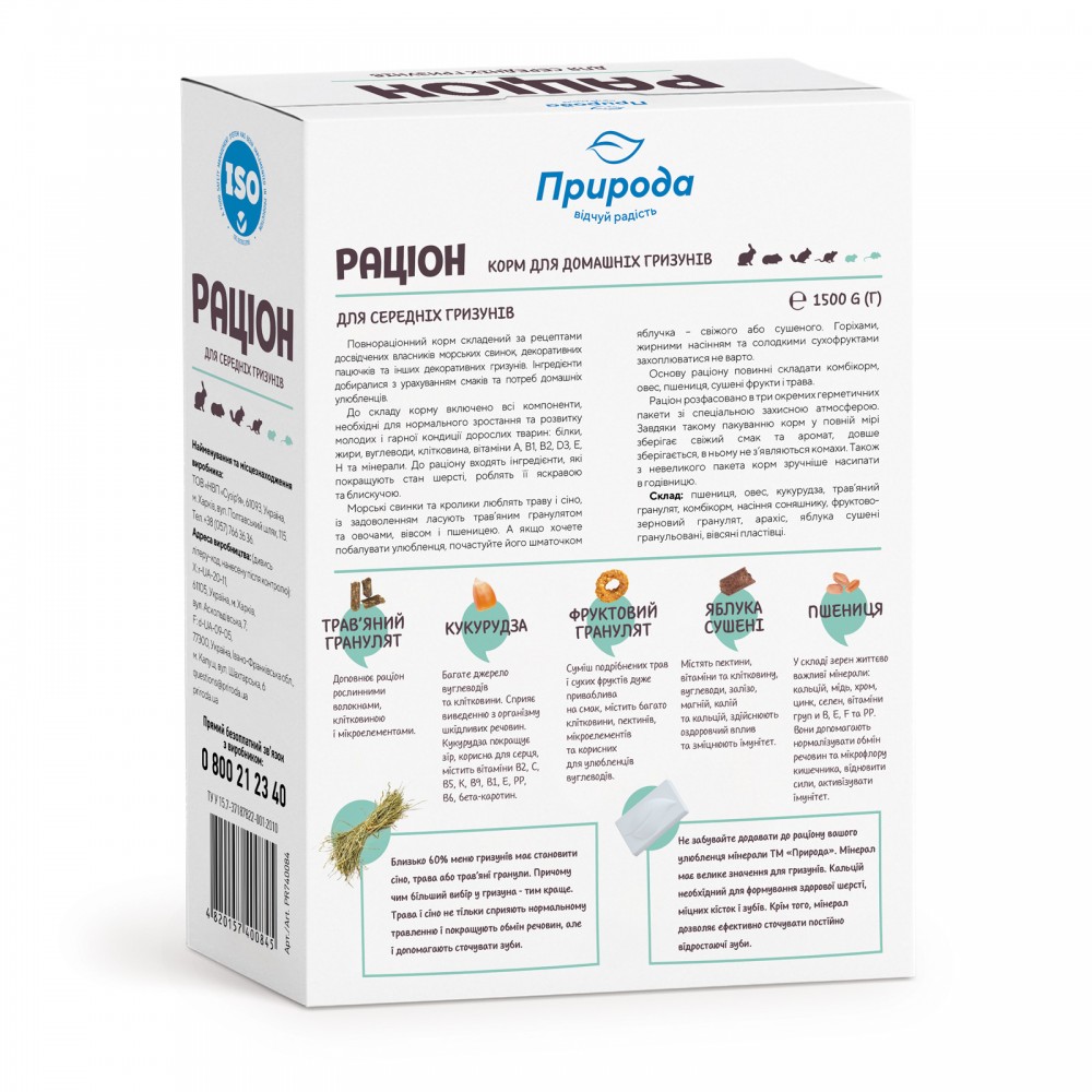 Овес є основним джерелом міді, калію, йоду, незамінних амінокислот, він нормалізує роботу органів травлення та дарує енергію. Комбікорм доповнює раціон клітковиною та допомагає сточувати зуби. Не забувайте додавати до раціону вашого улюбленця ласощі ТМ «Природа».