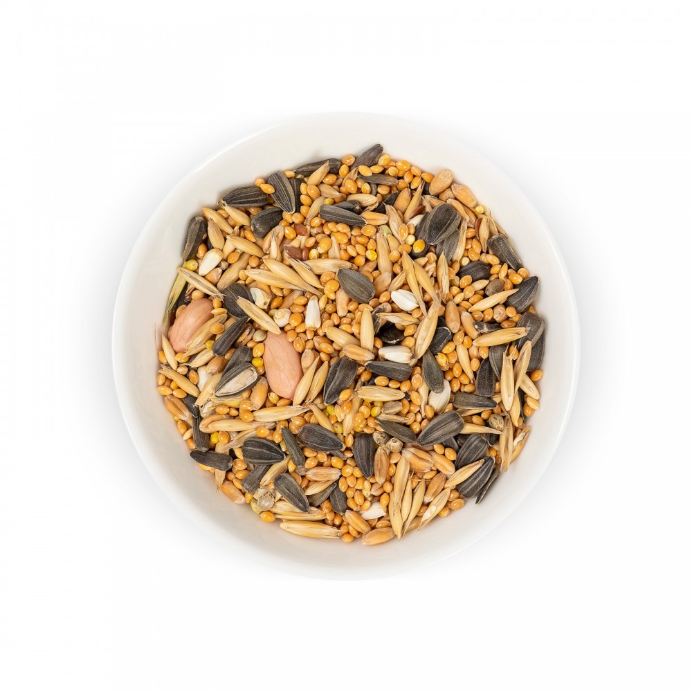 Склад: овес, насіння льону, канаркове насіння, насіння конопель, пшениця, насіння соняшнику, арахіс, яблука сушені гранульовані, сафлор, просо жовте, просо червоне
