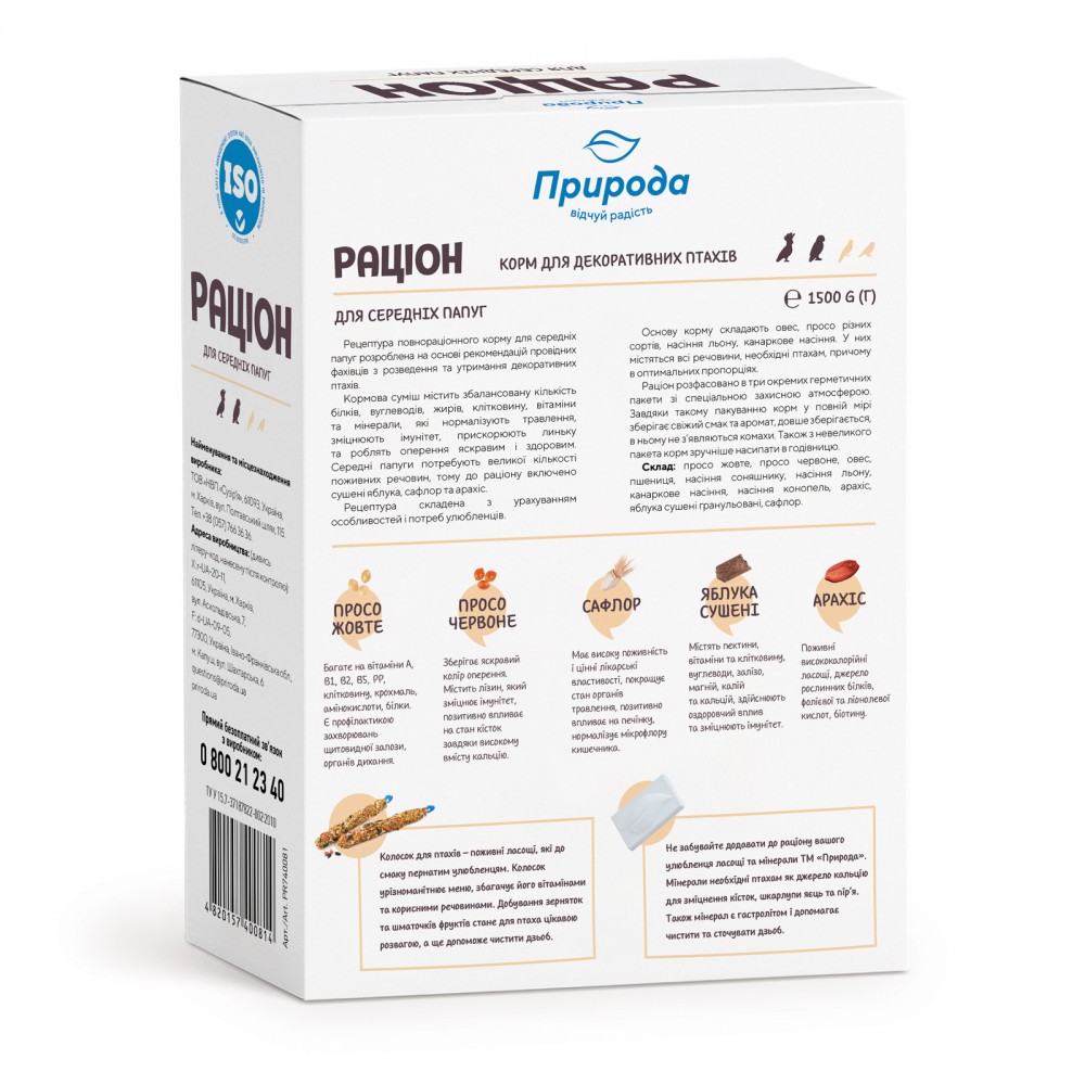 Повноцінний вітамінізований корм для середніх папуг. Кормова суміш містить енергетичні зернові компоненти, природні біостимулятори, подрібнені горіхи і сухофрукти, вітаміни і мінеральні речовини, які разом з горіхами і сухофруктами сприятливо впливають на зміцнення імунної системи, регулюють процеси травлення, прискорюють линьку, покращують яскравість декоративних птахів. Не забувайте додавати в раціон Вашого улюбленця ласощі ТМ «Природа».