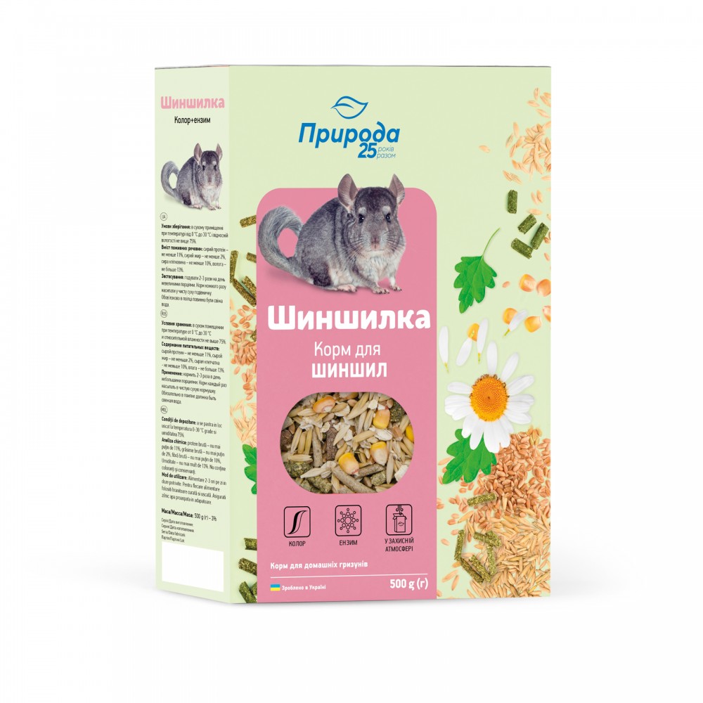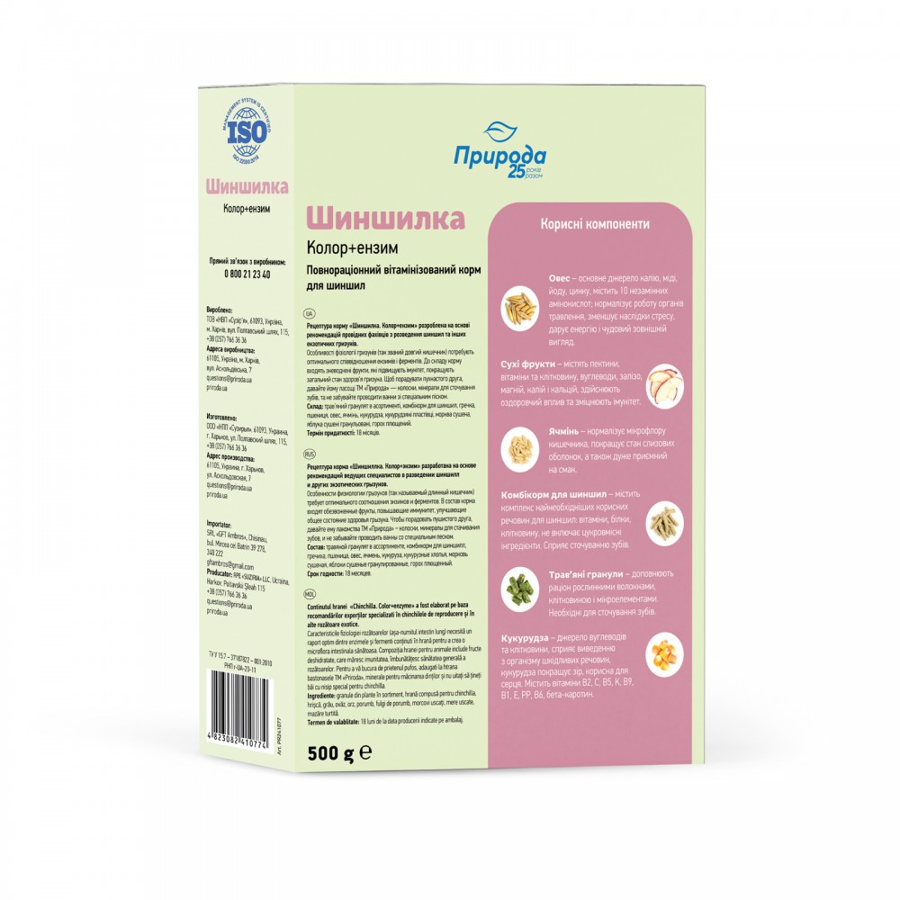Рецептура корму «Шиншилка. Колор+Ензим» розроблена на основі рекомендацій провідних фахівців з розведення шиншил та інших екзотичних гризунів. Особливості фізіології гризунів (так званий довгий кишечник) потребують оптимального співвідношення ензимів і ферментів для створення здорової мікрофлори кишечника.