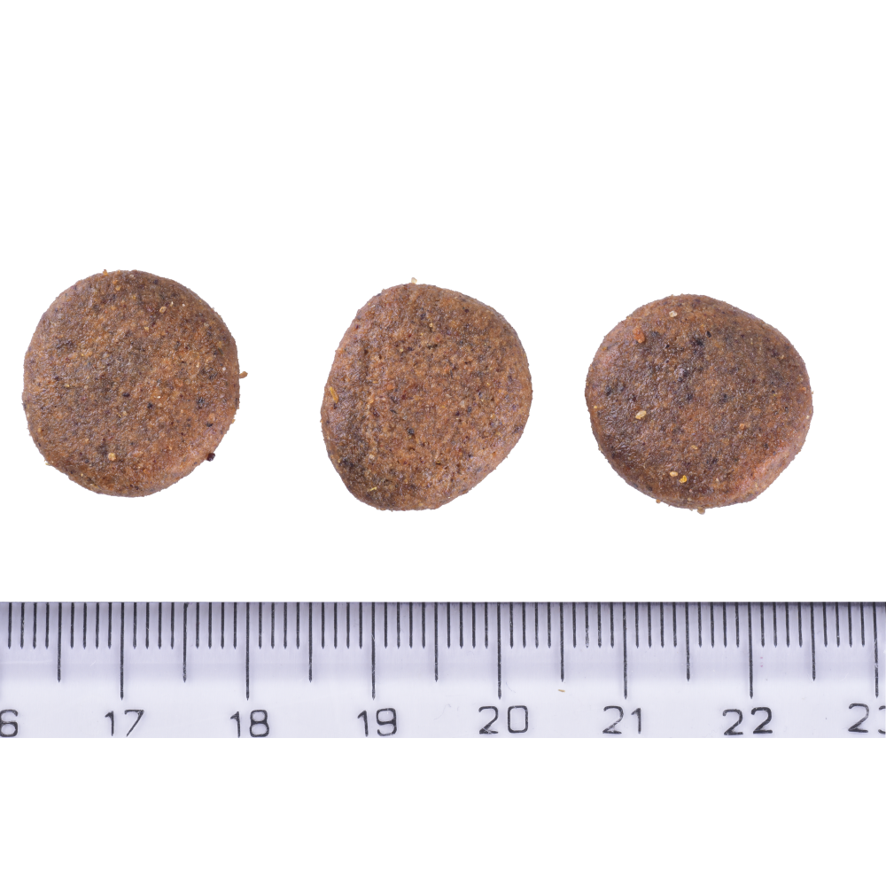 Аналітичний склад: сирий протеїн 25,0%, сирий жир 12,0%, вологість 10,0%, сира зола 6,5%, сира клітковина 6,2%, кальцій 1,1%, фосфор 0,8%, натрій 0,4%, омега-3 жирні кислоти 0,9%, омега-6 жирні кислоти 1,5%, EПК (20:5 n-3) 0,12%, ДГК (22:6 n-3) 0,16%.