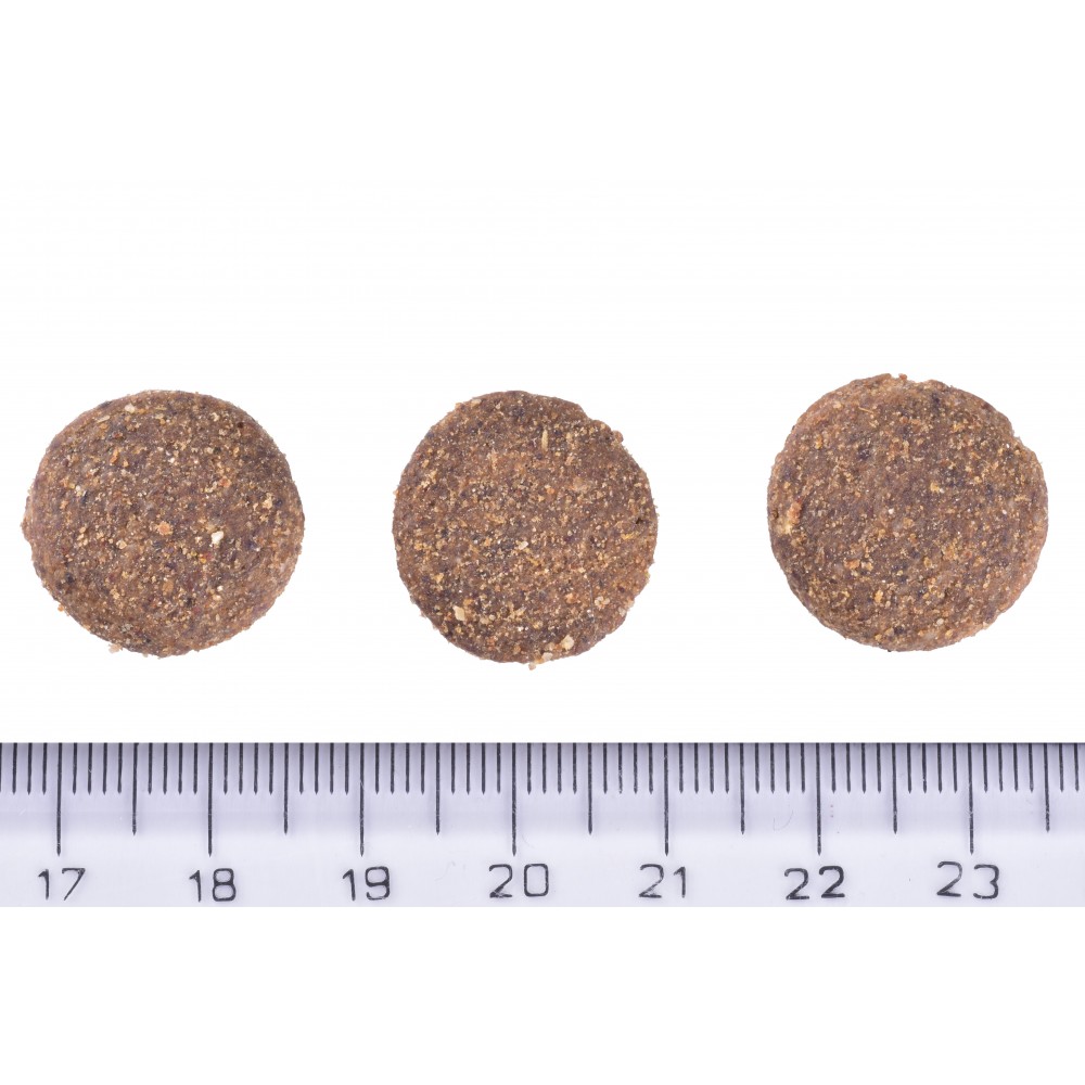 Аналітичний склад: сирий протеїн 25,0%, сирий жир 14,0%, вологість 10,0%, сира зола 5,5%, сира клітковина 2,8%, кальцій 1,3%, фосфор 1,0%, натрій 0,3%, Омега-3 жирні кислоти 0,4%, Омега-6 жирні кислоти 1,8%, ЕПК (20:5 n-3) 0,05%, ДГК (22:6 n-3) 0,1%.
