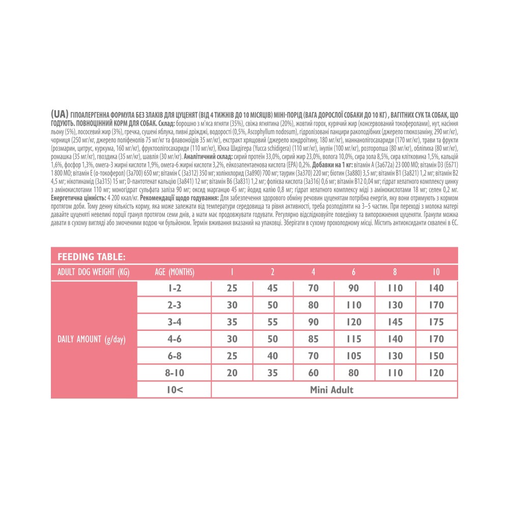 Гіпоалергенна формула з ягнятиною, без злаків для цуценят (від 2 тижнів до 10 місяців) мініпорід (до 10 кг), вагітних сук та собак, що годують. Повноцінний корм суперпреміум класу.