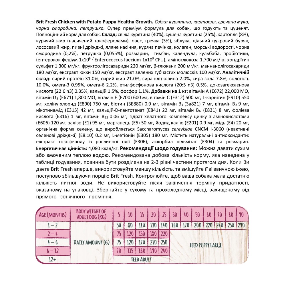 Можна давати сухим або змоченим теплою водою. Рекомендована добова кількість корму, яка наведена у таблиці годування, повинна бути розділена на 2-3 рівні частини протягом дня. Коли Ви даєте Brit Fresh вперше, використовуйте меншу кількість, та змішуйте її зі звичною їжею, поступово збільшуючи порцію Brit Fresh. Контролюйте, щоб ваша собака мала достатню кількість питної води. Не використовуйте після закінчення терміну придатності, вказаному на упаковці. Зберігайте у сухому та прохолодному місці, захищеному від прямого сонячного проміння. Після відкриття герметично закривайте упаковку.