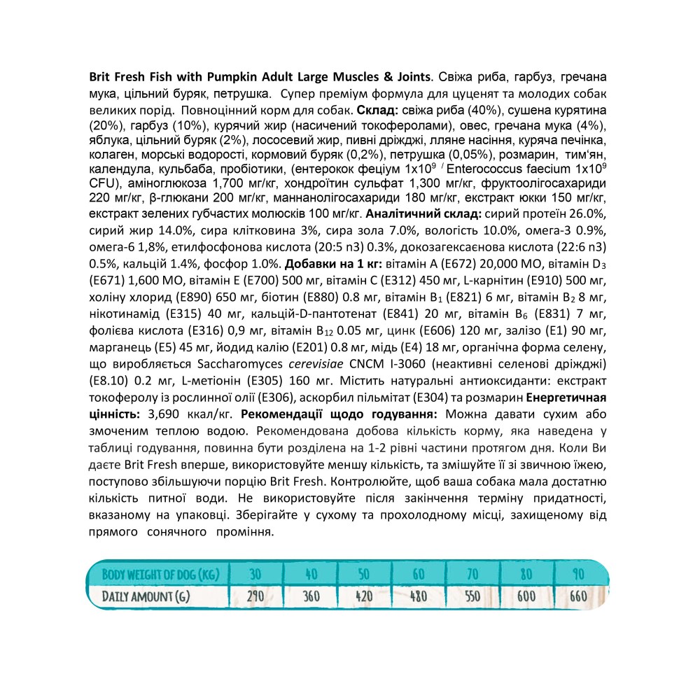 Інструкція з годування: Можна давати сухим або змоченим теплою водою. Рекомендована добова кількість корму, яка наведена у таблиці годування, повинна бути розділена на 1-2 рівні частини протягом дня. Коли Ви даєте Brit Fresh вперше, використовуйте меншу кількість, та змішуйте її зі звичною їжею, поступово збільшуючи порцію Brit Fresh. Контролюйте, щоб ваша собака мала достатню кількість питної води. Не використовуйте після закінчення терміну придатності, вказаному на упаковці. Зберігайте у сухому та прохолодному місці, захищеному від прямого сонячного проміння. Після відкриття герметично закривайте упаковку.