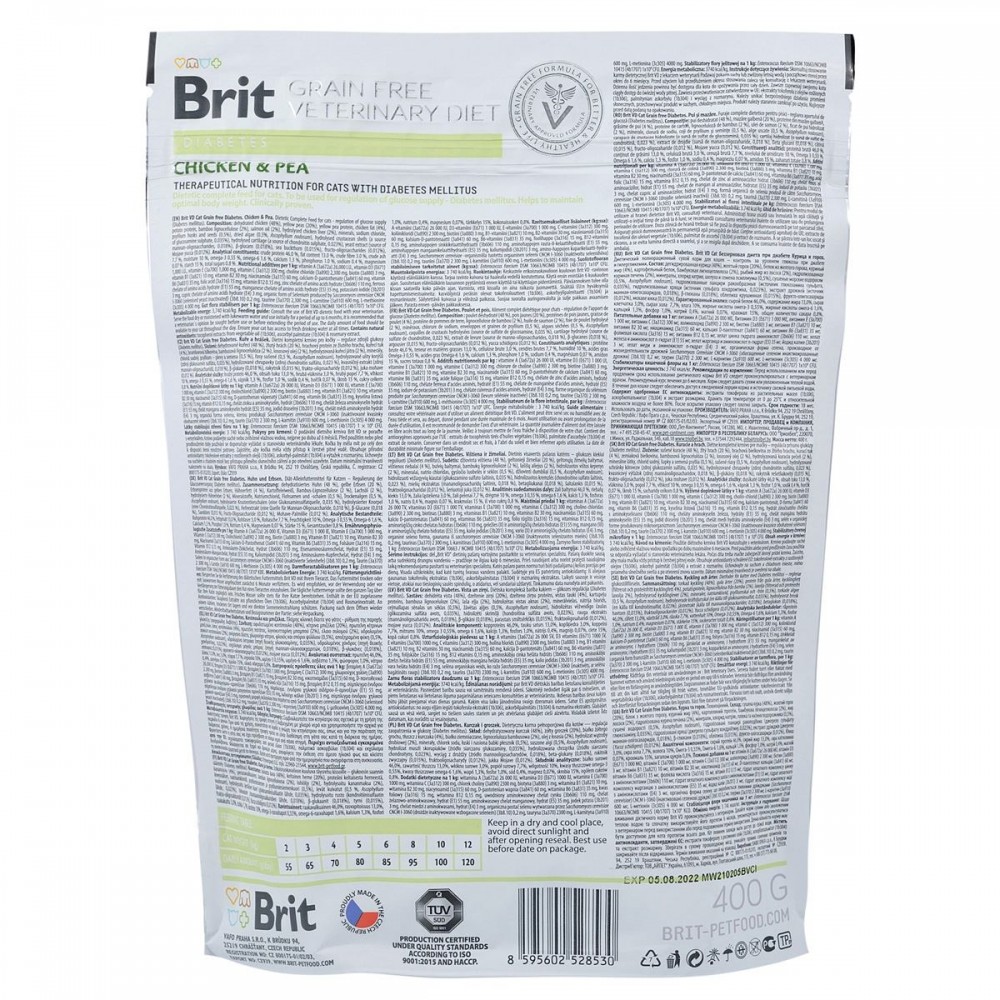 Brit Grain Free Veterinary Diet Diabetes - повноцінний дієтичний беззерновий корм, який вживається для корекції рівня цукру в крові при діабеті та гіперглікемії у дорослих котів. Допомагає підтримувати оптимальну вагу.