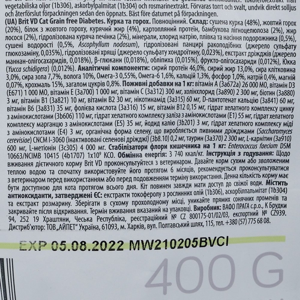 Початковий період годування: Використовуйте Brit VD Diabetes Cat протягом 6 місяців. Щоденну кількість корму слід розділити на кілька порцій і давати через певні проміжки часу в залежності від стану здоров'я кішки. Для отримання оптимальної дози інсуліну необхідні регулярні перевірки рівня глюкози в крові. Не годуйте кішку жодним іншим кормом для тварин або харчовими продуктами для людини та закусками.