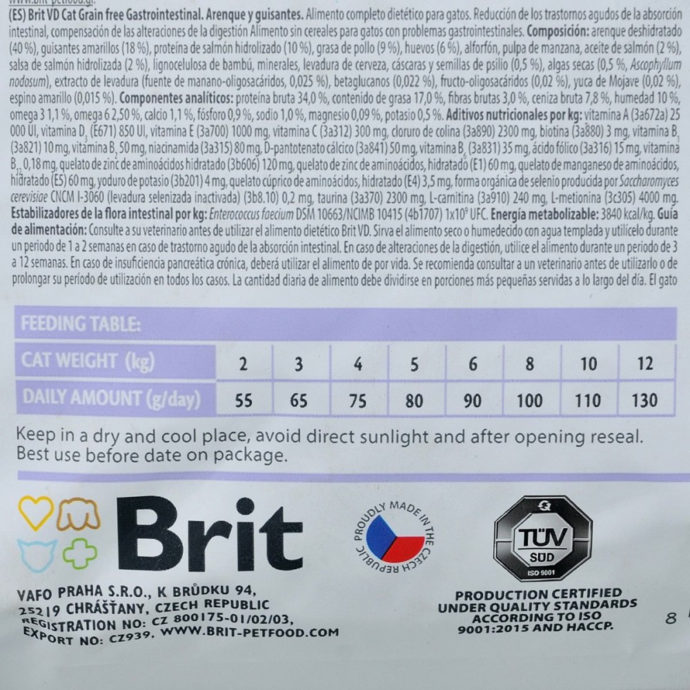 Хронічні шлунково-кишкові проблеми: У разі порушення мальдігестії використовуйте Brit VD Gastrointestinal Cat протягом 3–12 тижнів. У випадку хронічних шлунково-кишкових проблем корм слід використовувати протягом усього життя.