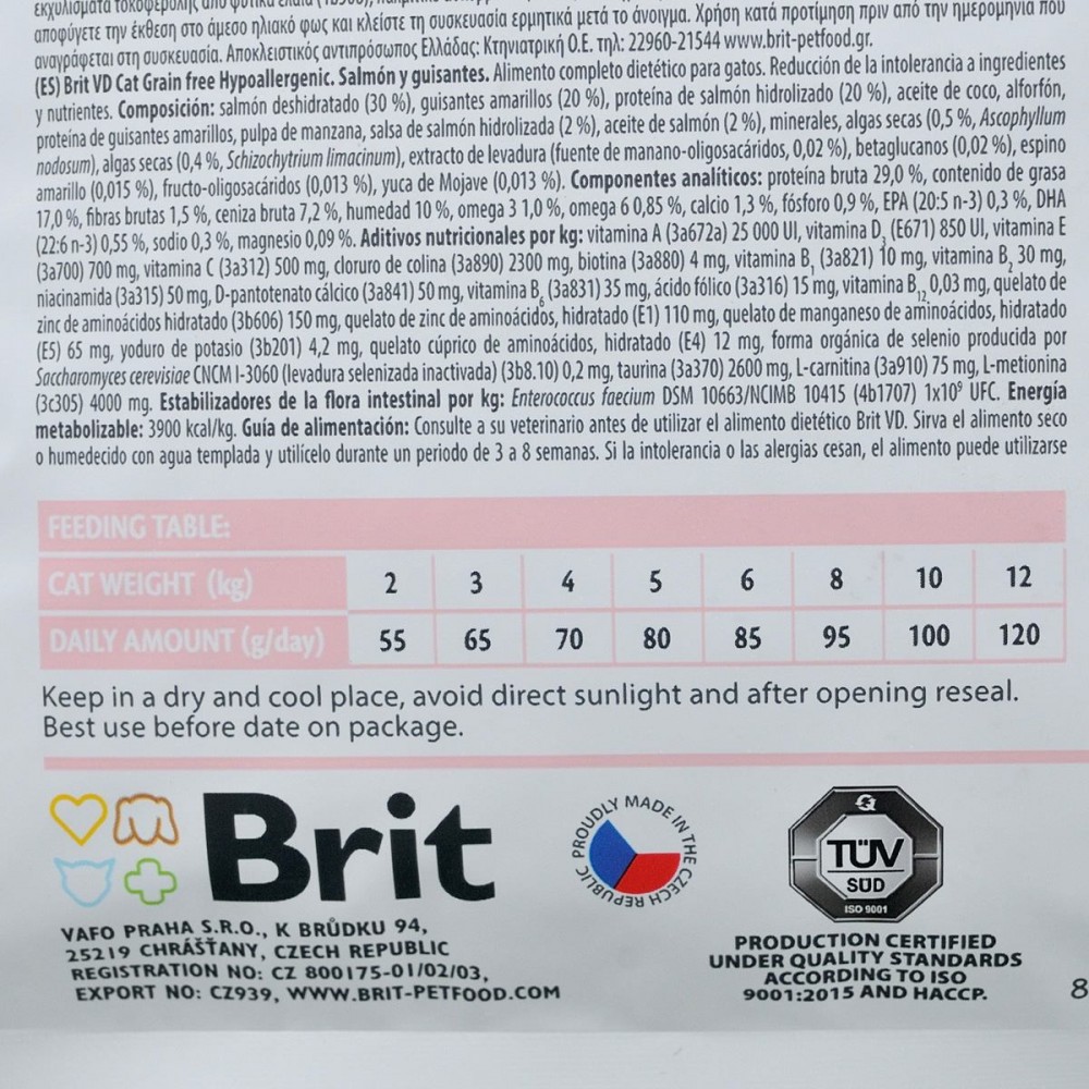 Усунення харчових алергічних реакцій і харчової непереносимості: Годуйте тільки Brit VD Hypoallergenic Cat і водою протягом 6–8 тижнів. Не годуйте жодним іншим кормом для тварин або харчовими продуктами для людини, закусками чи добавками.