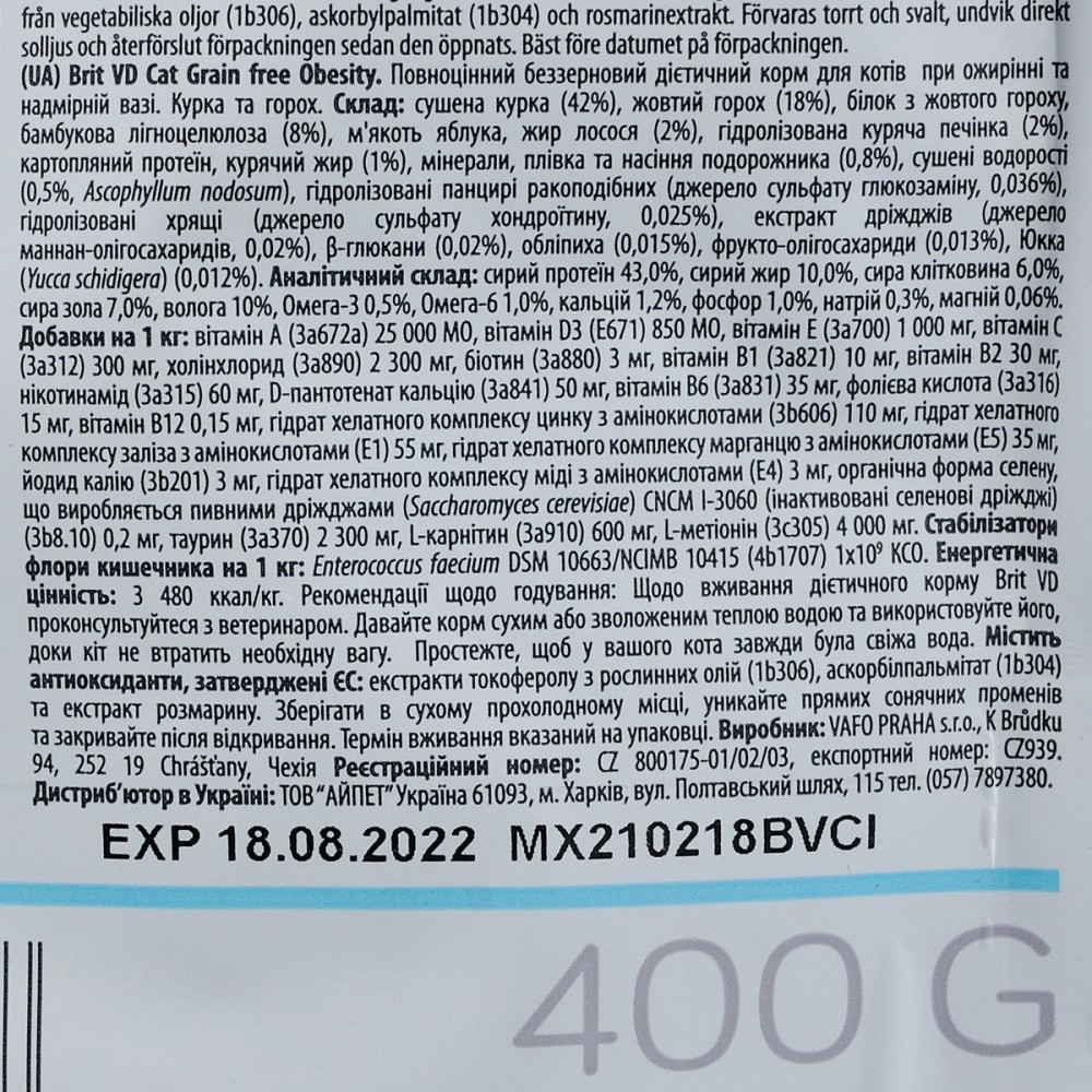 Підтримання оптимальної ваги: Після бажаного зниження ваги продовжуйте годувати скориговану дозу Brit VD Obesity Cat протягом наступних 6 місяців.