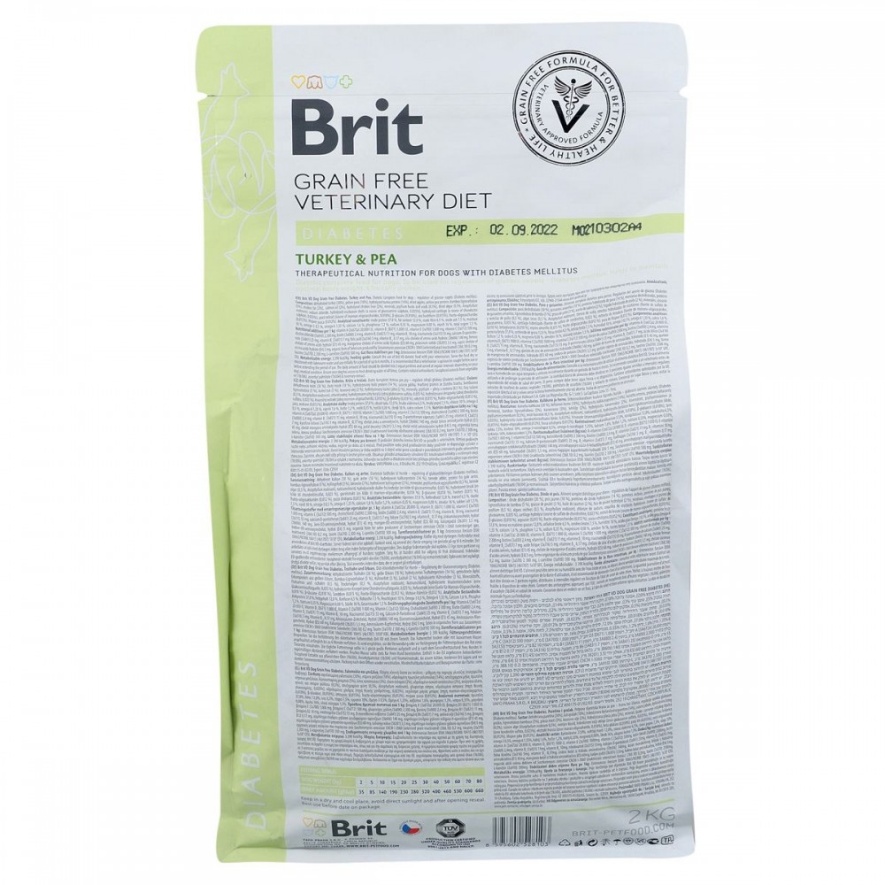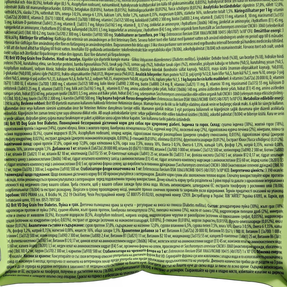 Початковий період годування: Використовуйте Brit VD Diabetes Dog протягом 6 місяців. Щоденну кількість корму слід розділити на 3 рівні порції і давати через певні проміжки часу в залежності від стану здоров'я собаки. Для отримання оптимальної дози інсуліну необхідні регулярні перевірки рівня глюкози в крові. Не годуйте собаку жодним іншим кормом або харчовими продуктами для людини та закусками.